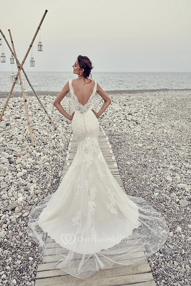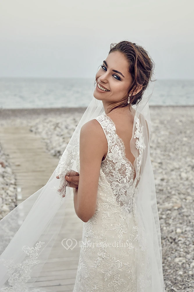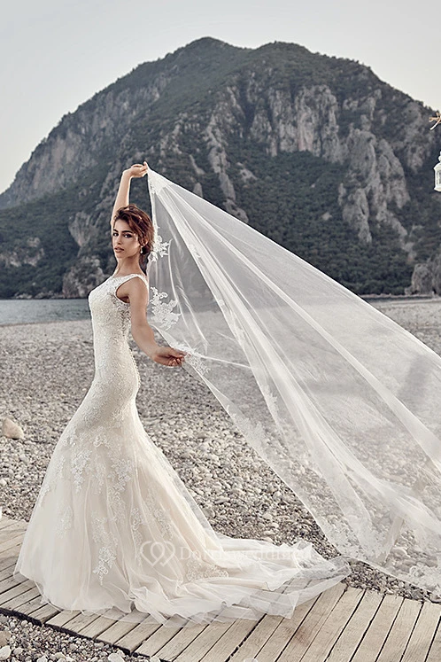 Sheath Sleeveless Long Scoop-Neck Tulle&Lace Wedding Dress With Appliques And Deep-V Back