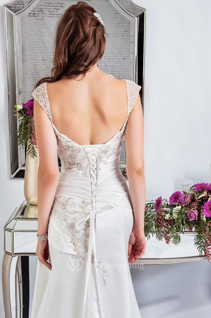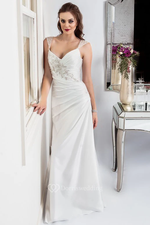 Sheath Sleeveless Long V-Neck Side-Draped Satin Wedding Dress With Beading And Corset Back