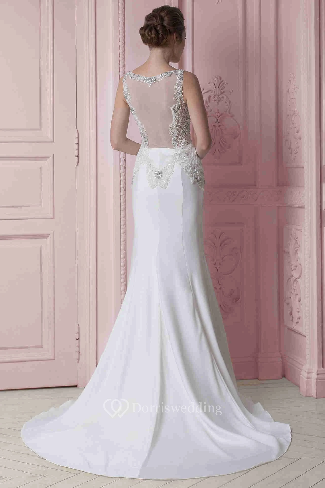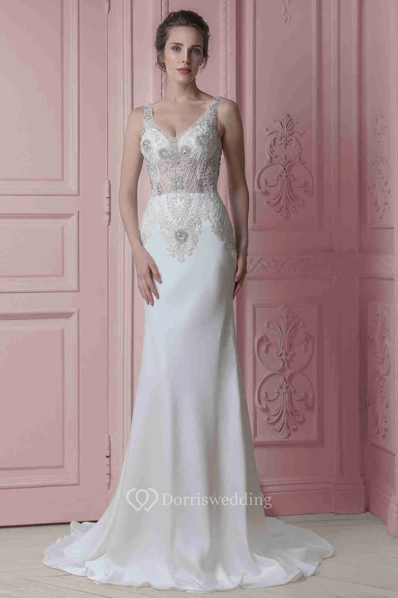 Sheath Sleeveless Maxi V-Neck Beaded Stretched Satin Wedding Dress