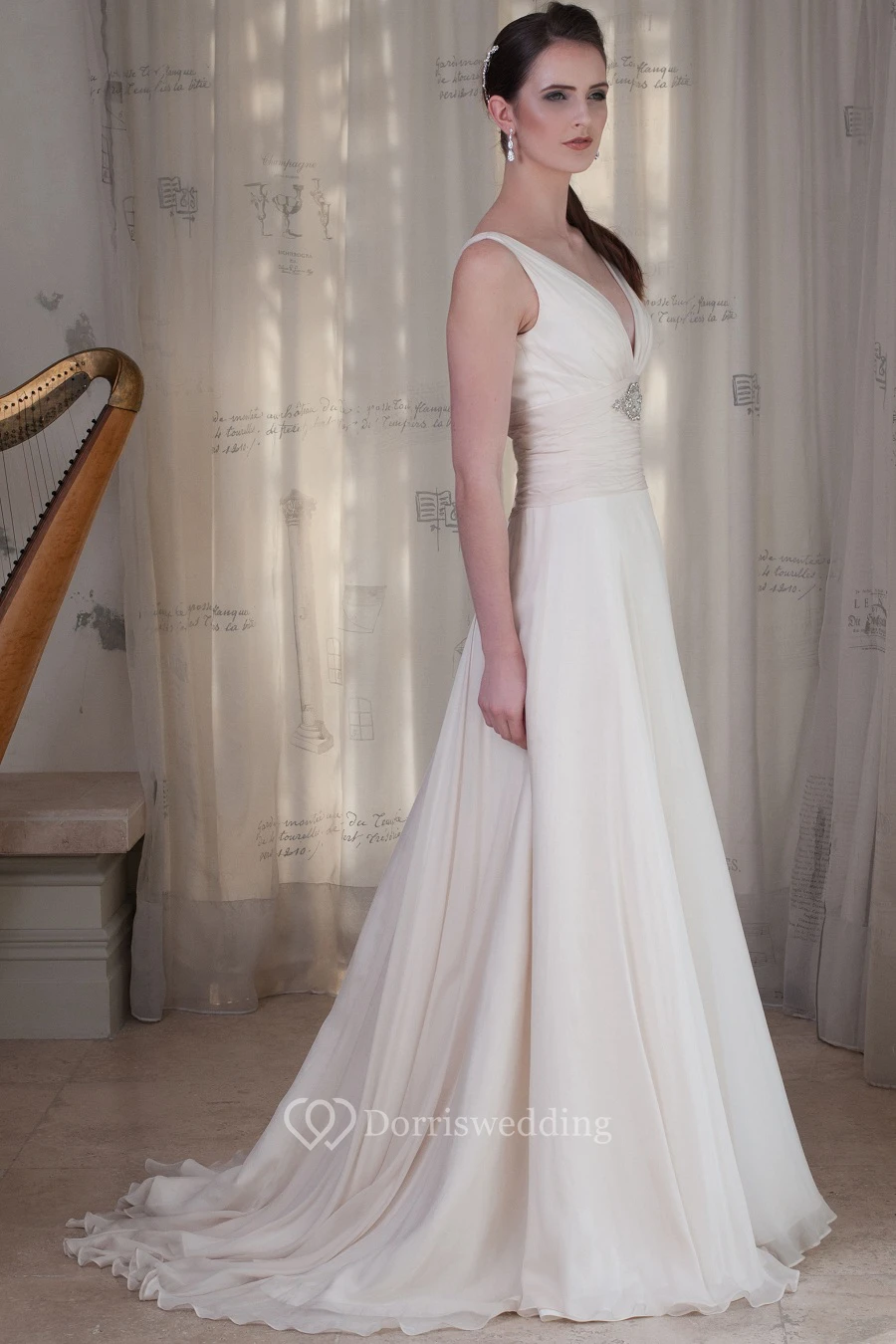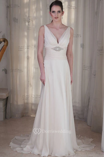 Sheath Sleeveless Ruched V-Neck Floor-Length Wedding Dress With Waist Jewellery