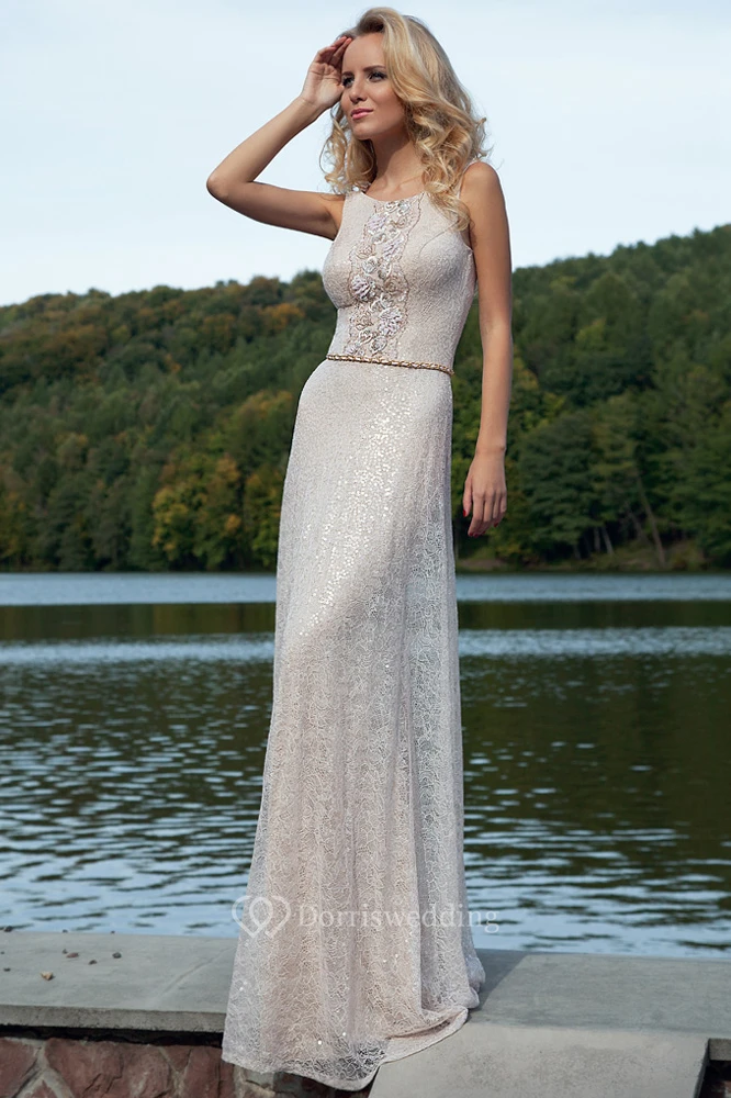 Sheath Sleeveless Scoop Appliqued Floor-Length Lace Prom Dress