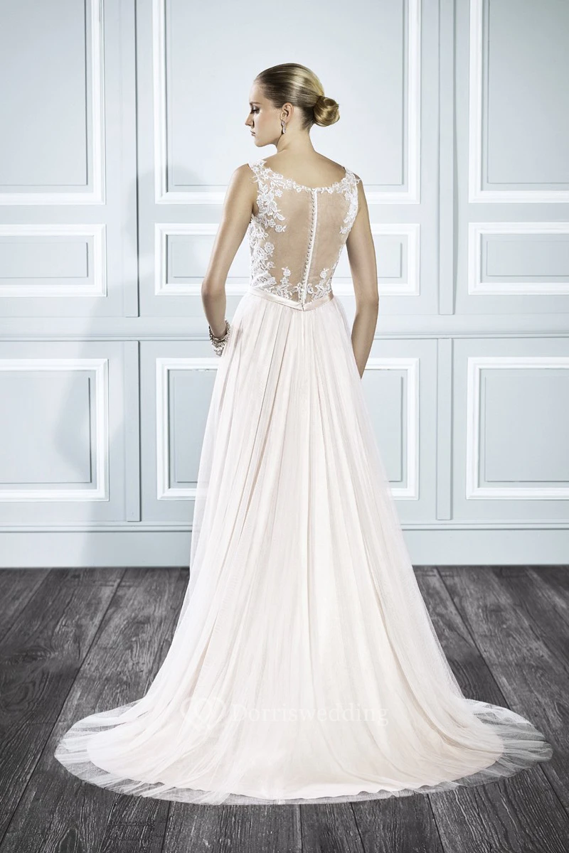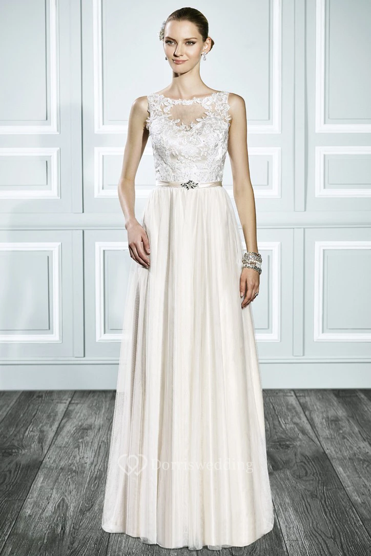 Sheath Sleeveless Scoop Maxi Appliqued Lace Wedding Dress With Pleats And Illusion Back