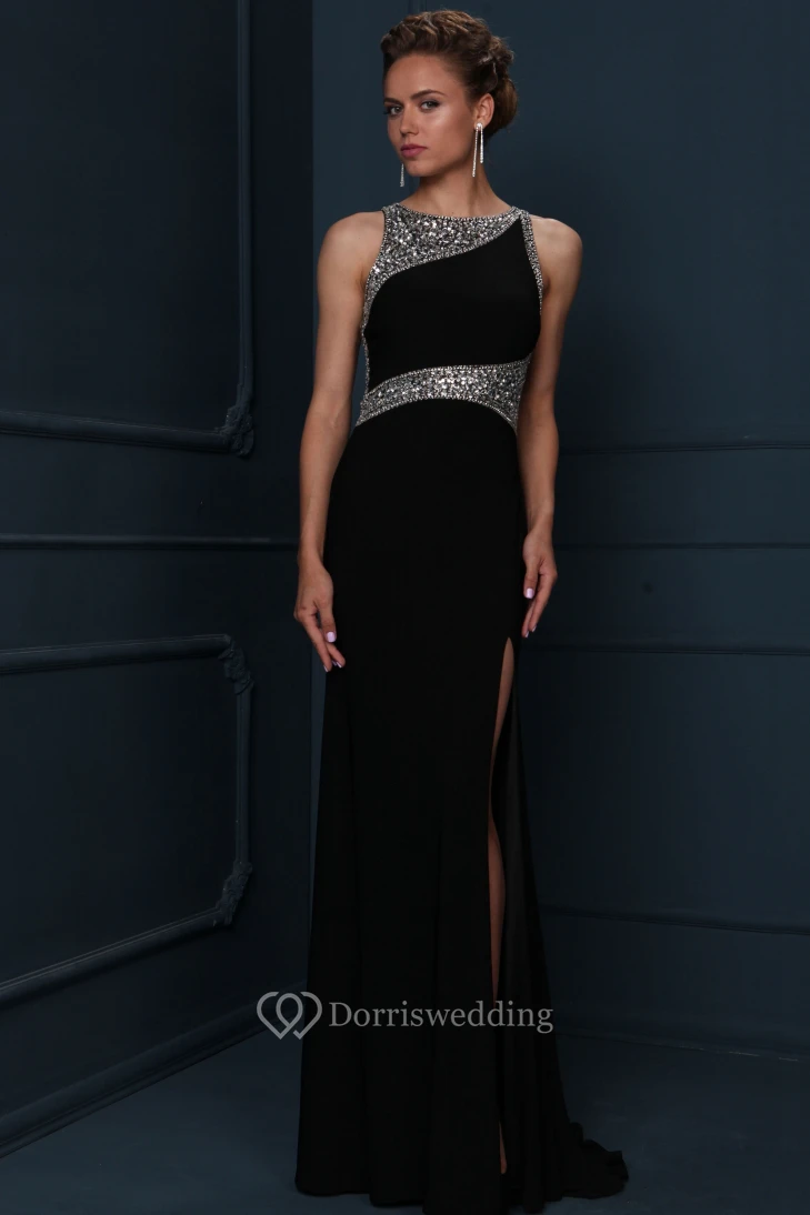 Sheath Sleeveless Scoop-Neck Beaded Floor-Length Jersey Evening Dress With Split Front