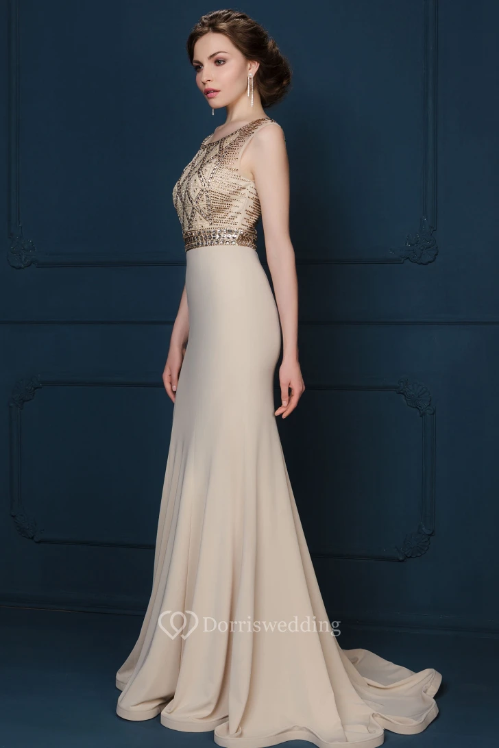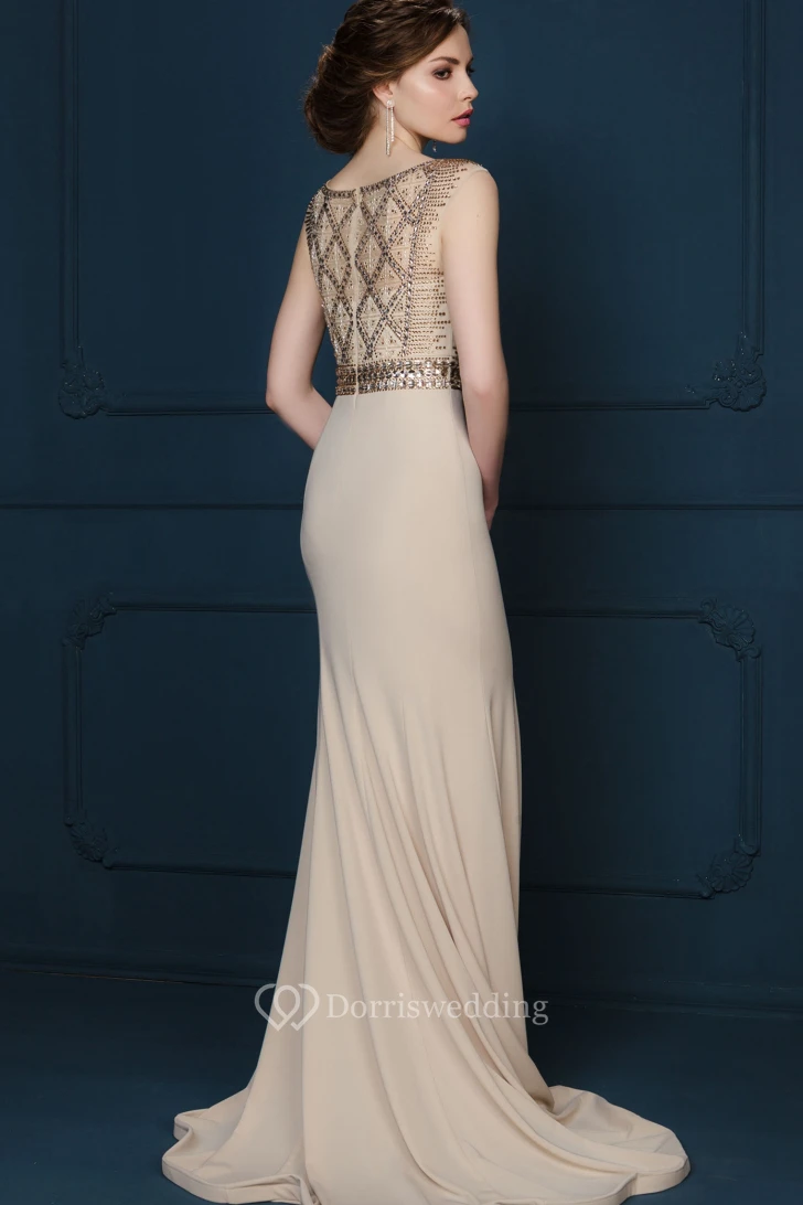 Sheath Sleeveless Scoop-Neck Floor-Length Crystal Jersey Evening Dress With Pleats