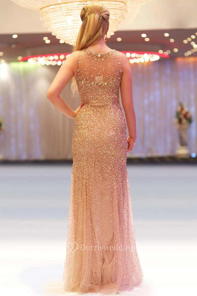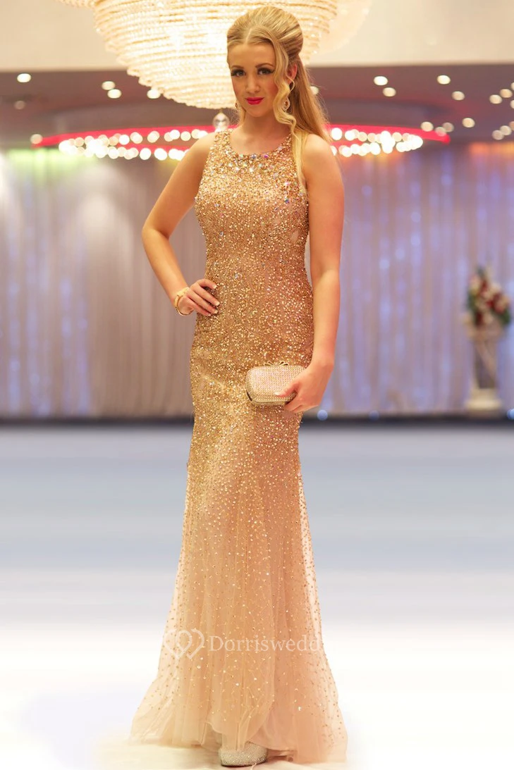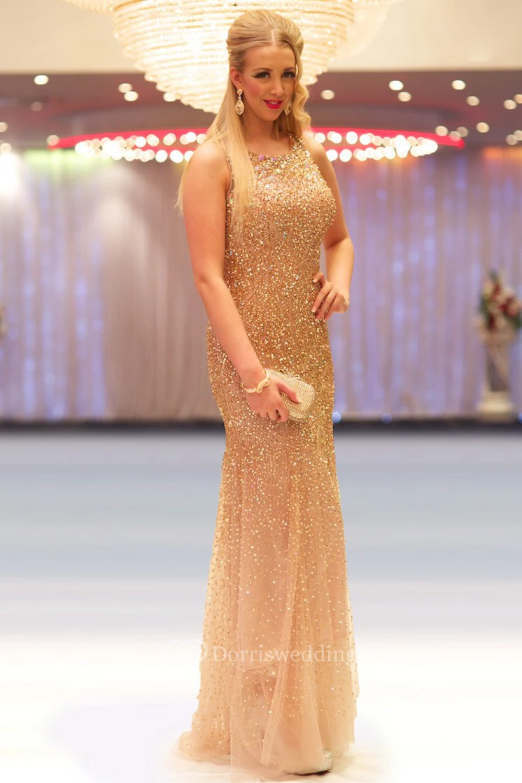 Sheath Sleeveless Scoop-Neck Floor-Length Sequins&Tulle Prom Dress