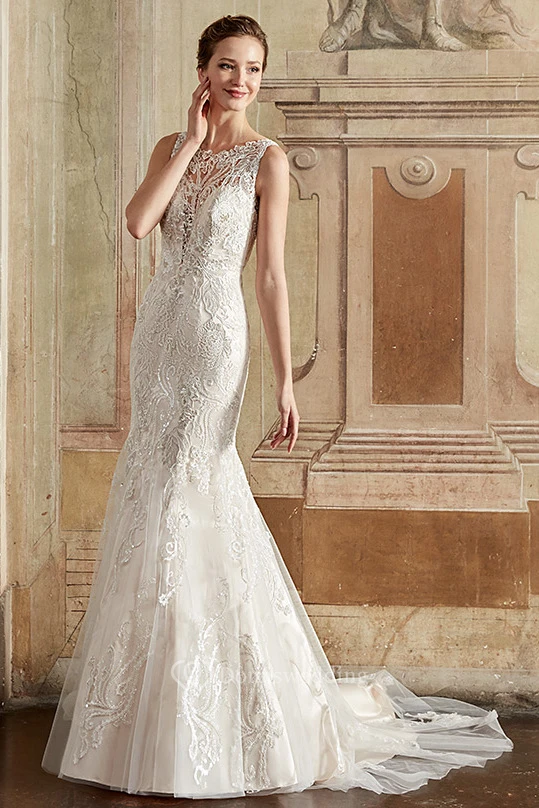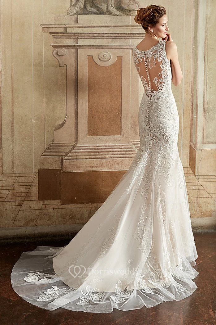 Sheath Sleeveless Scoop-Neck Long Appliqued Lace Wedding Dress