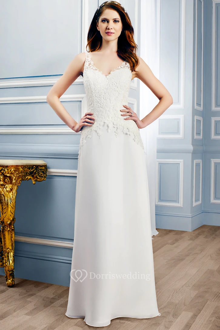 Sheath Sleeveless V-Neck Appliqued Floor-Length Lace Wedding Dress With Sweep Train And Illusion Back
