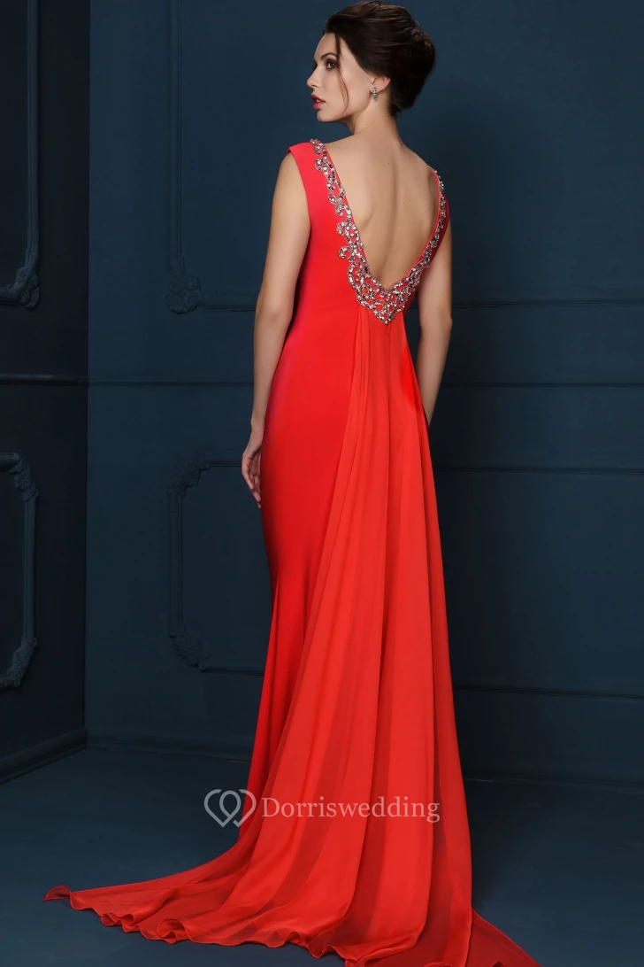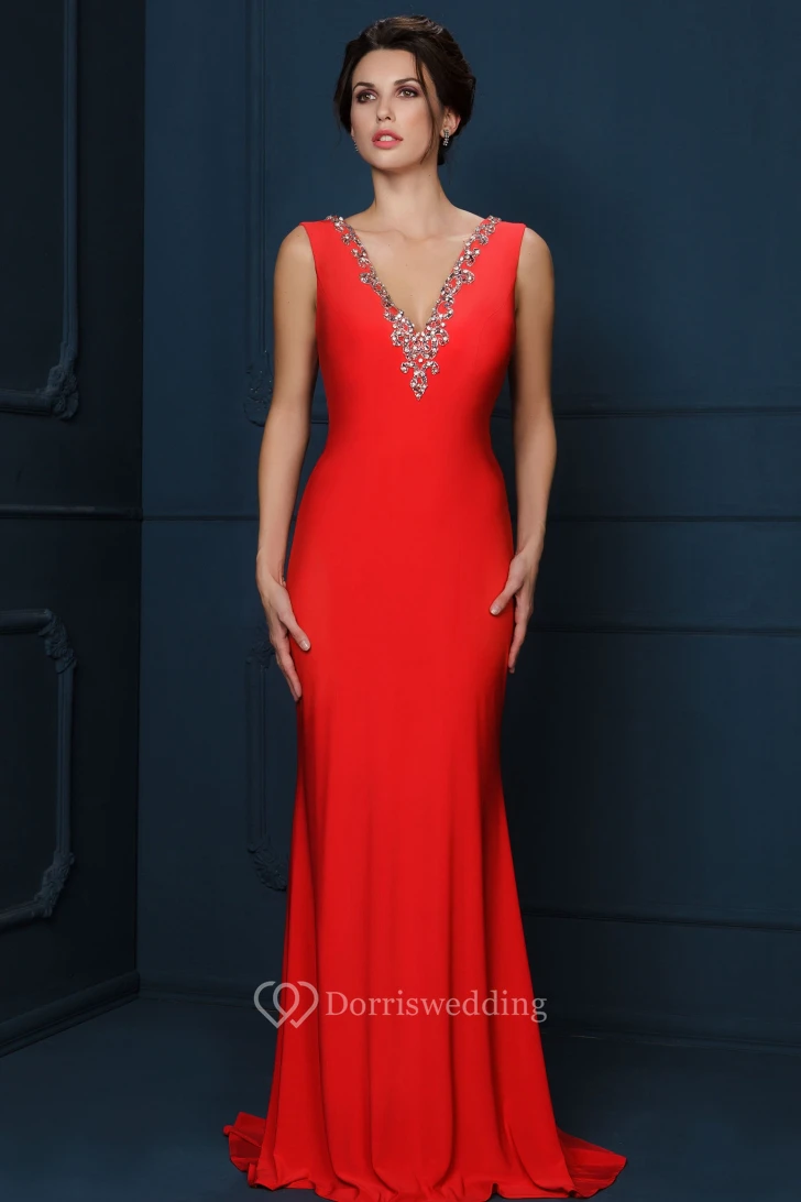 Sheath Sleeveless V-Neck Beaded Maxi Jersey Evening Dress