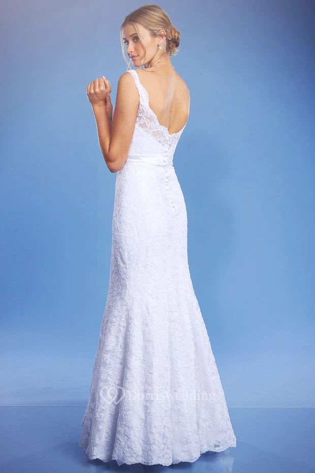 Sheath Sleeveless V-Neck Floor-Length Lace Wedding Dress With Low-V Back