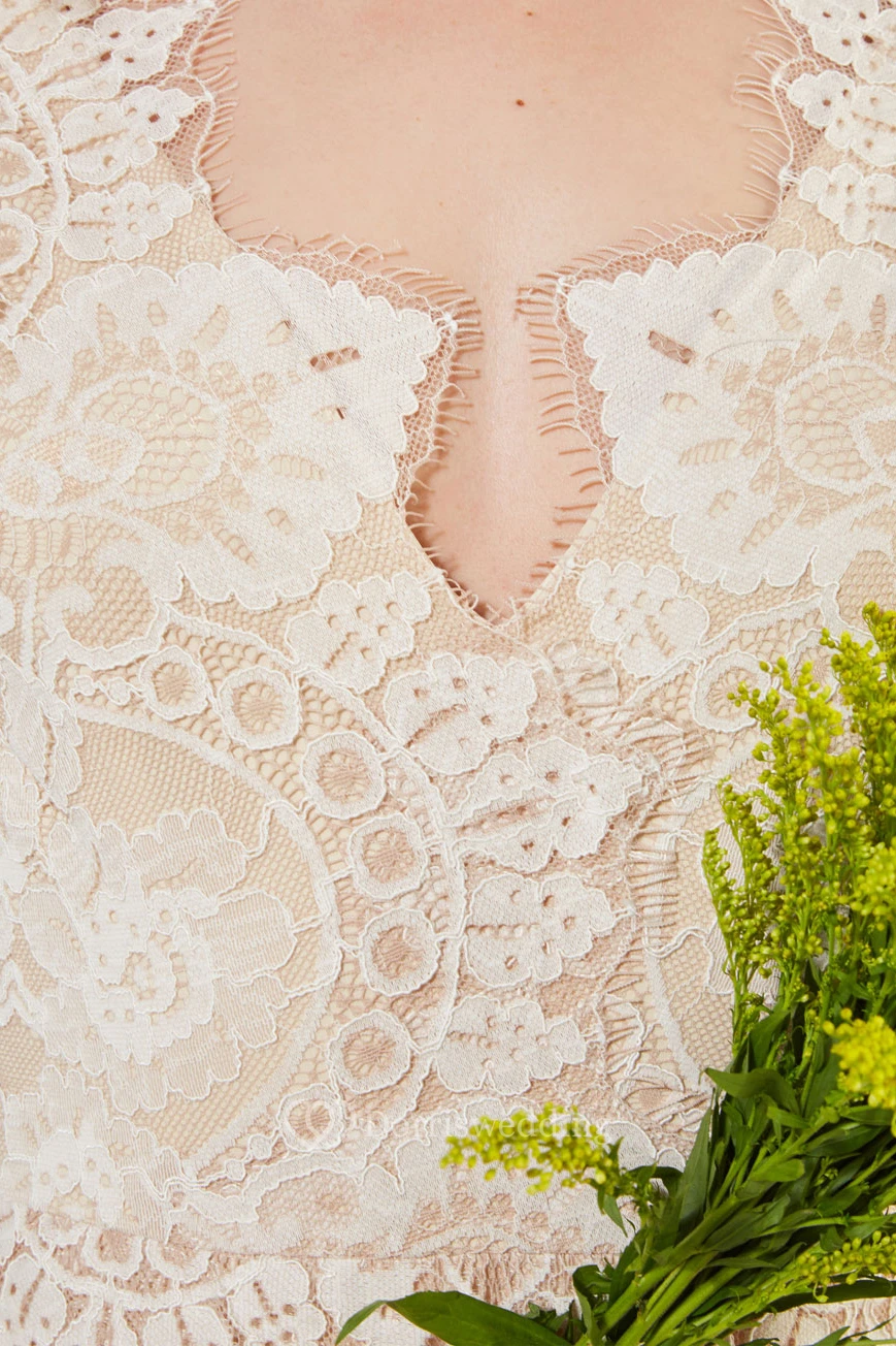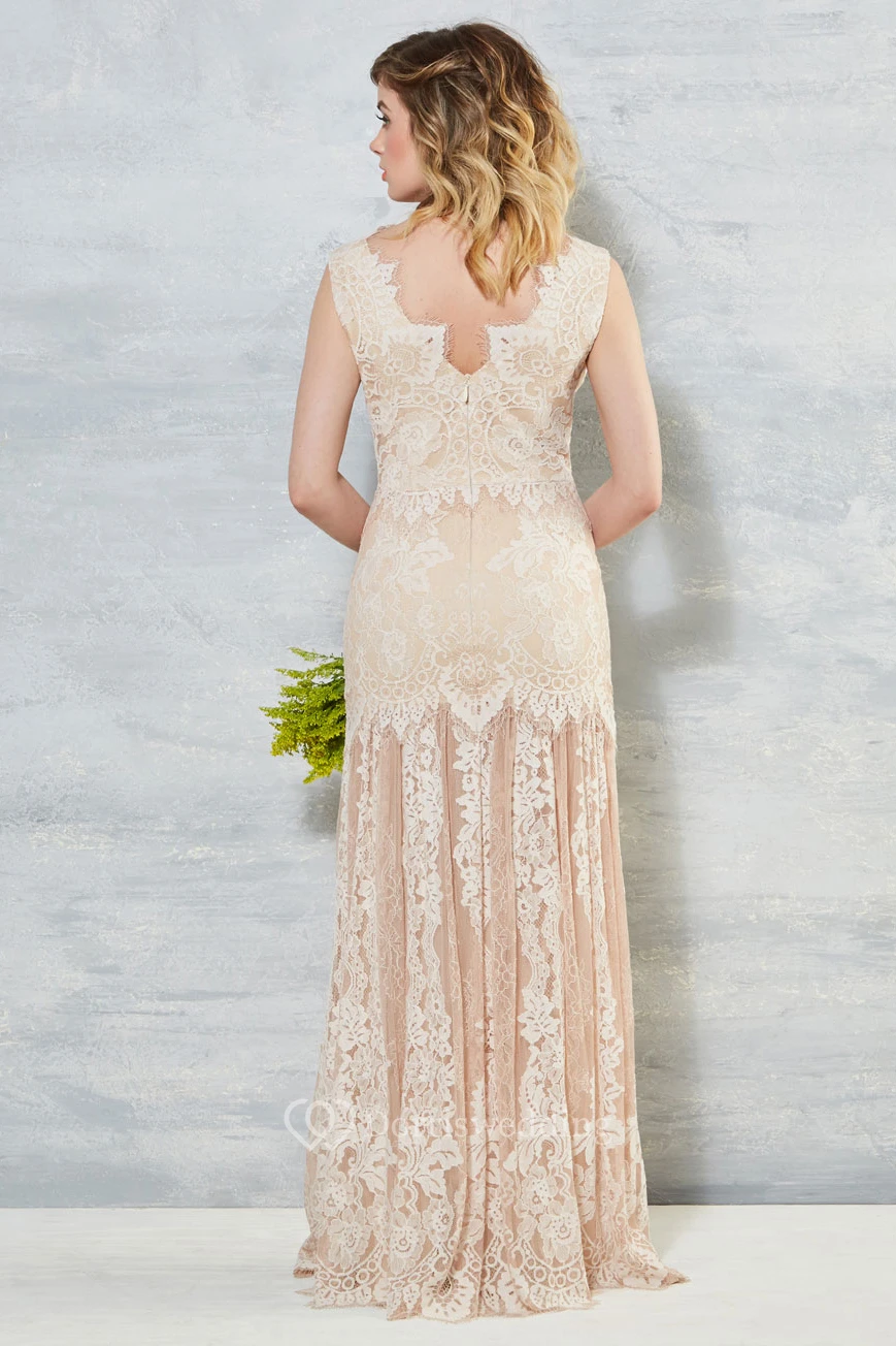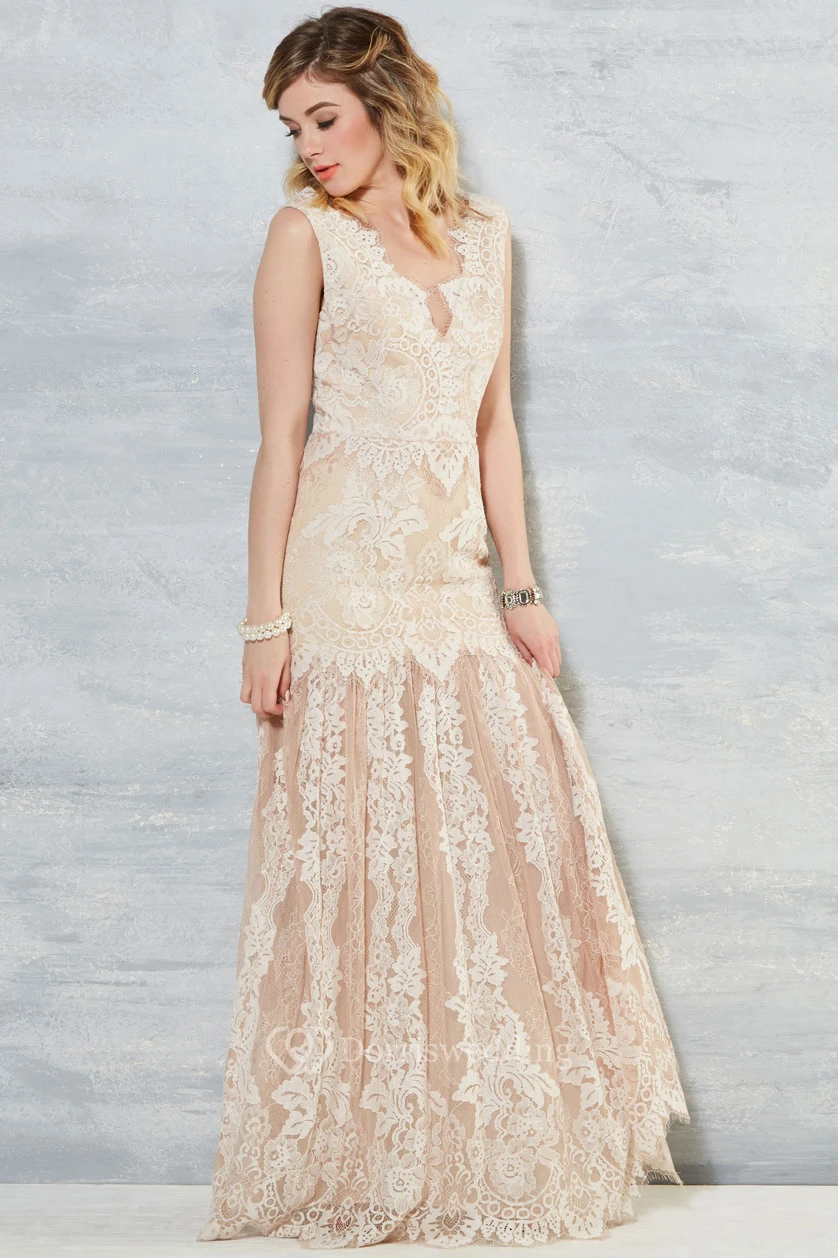 Sheath Sleeveless V-Neck Long Lace Wedding Dress With Appliques And V Back