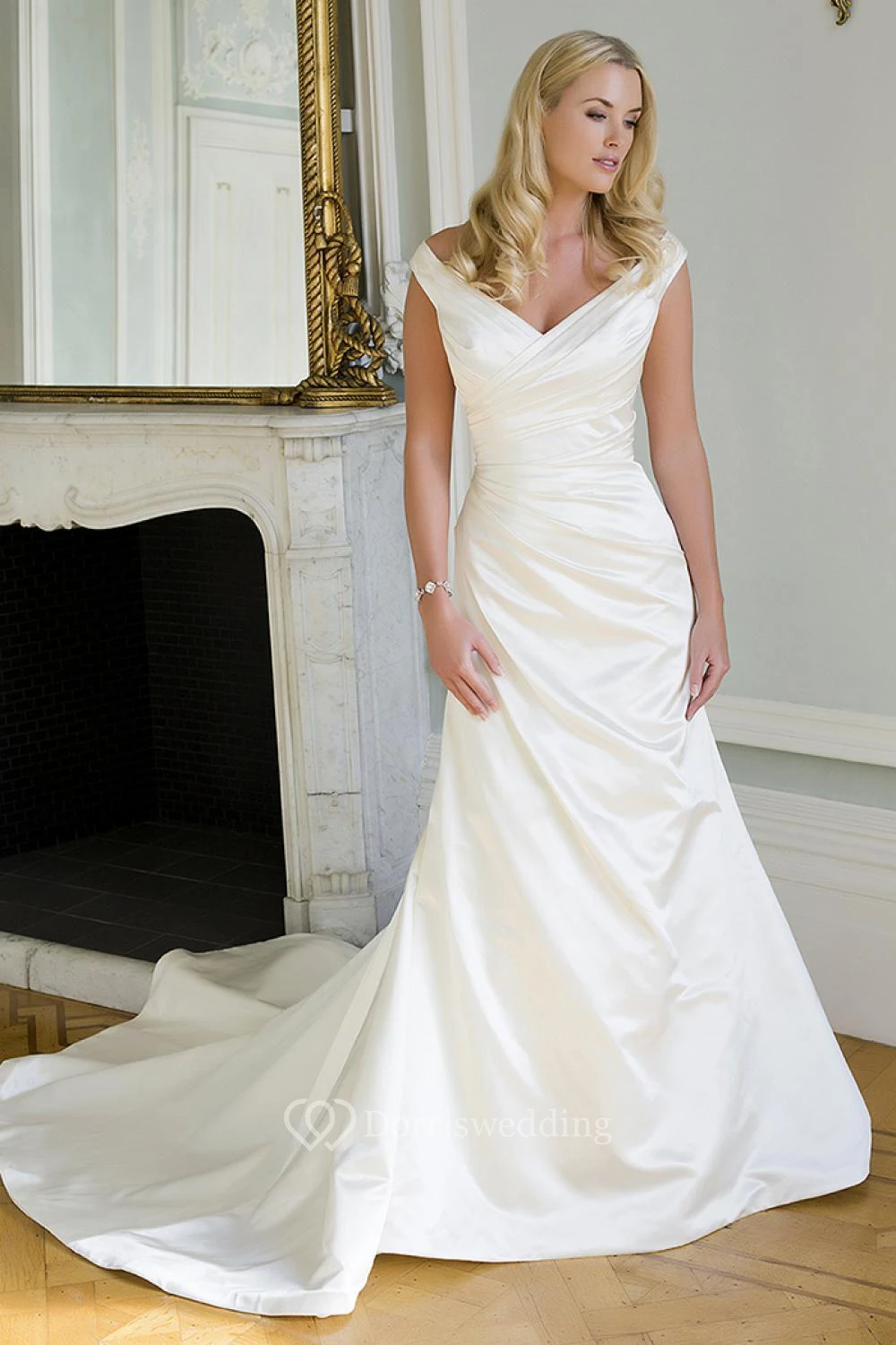 Sheath Sleeveless V-Neck Long Satin Wedding Dress With Side Draping And V Back