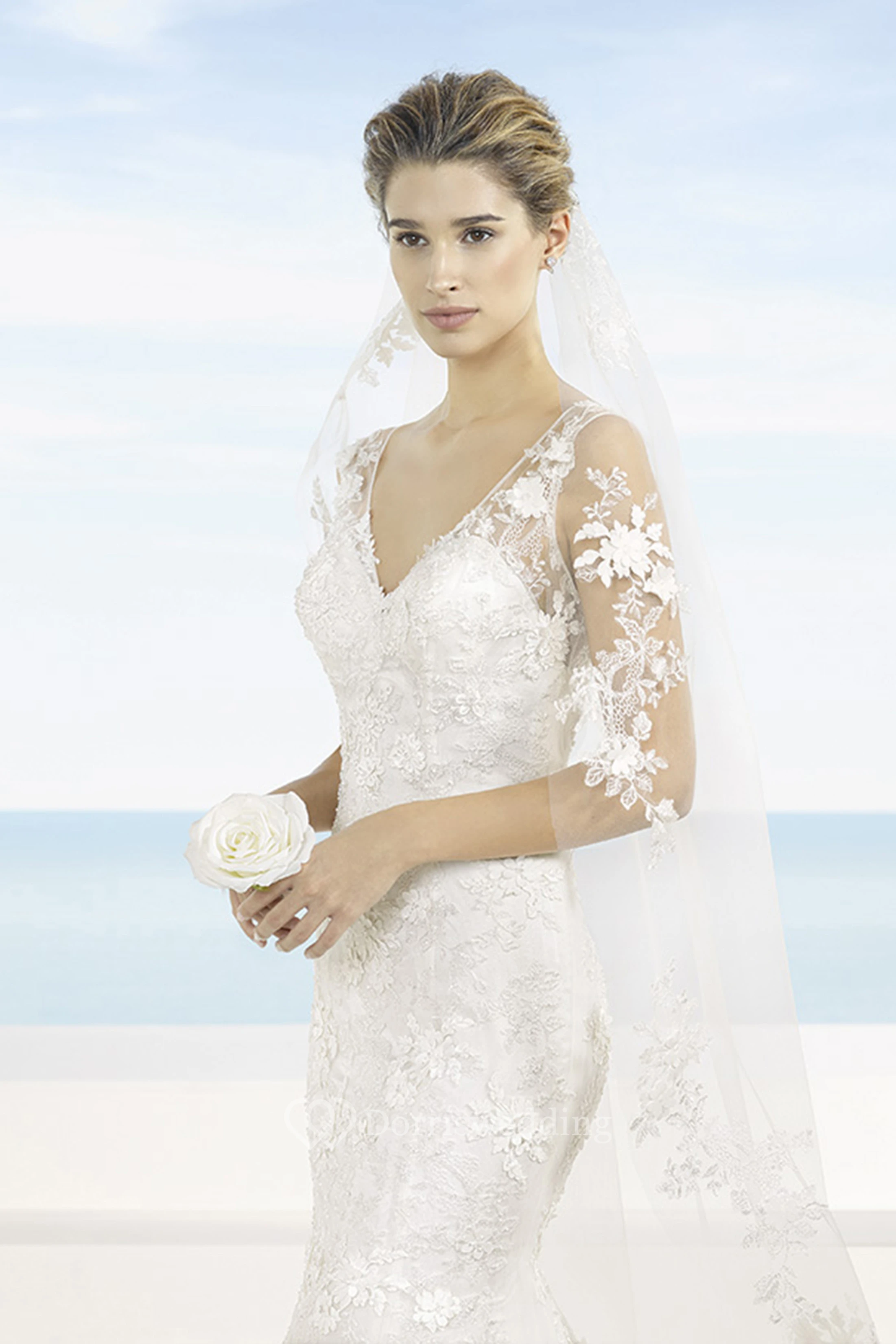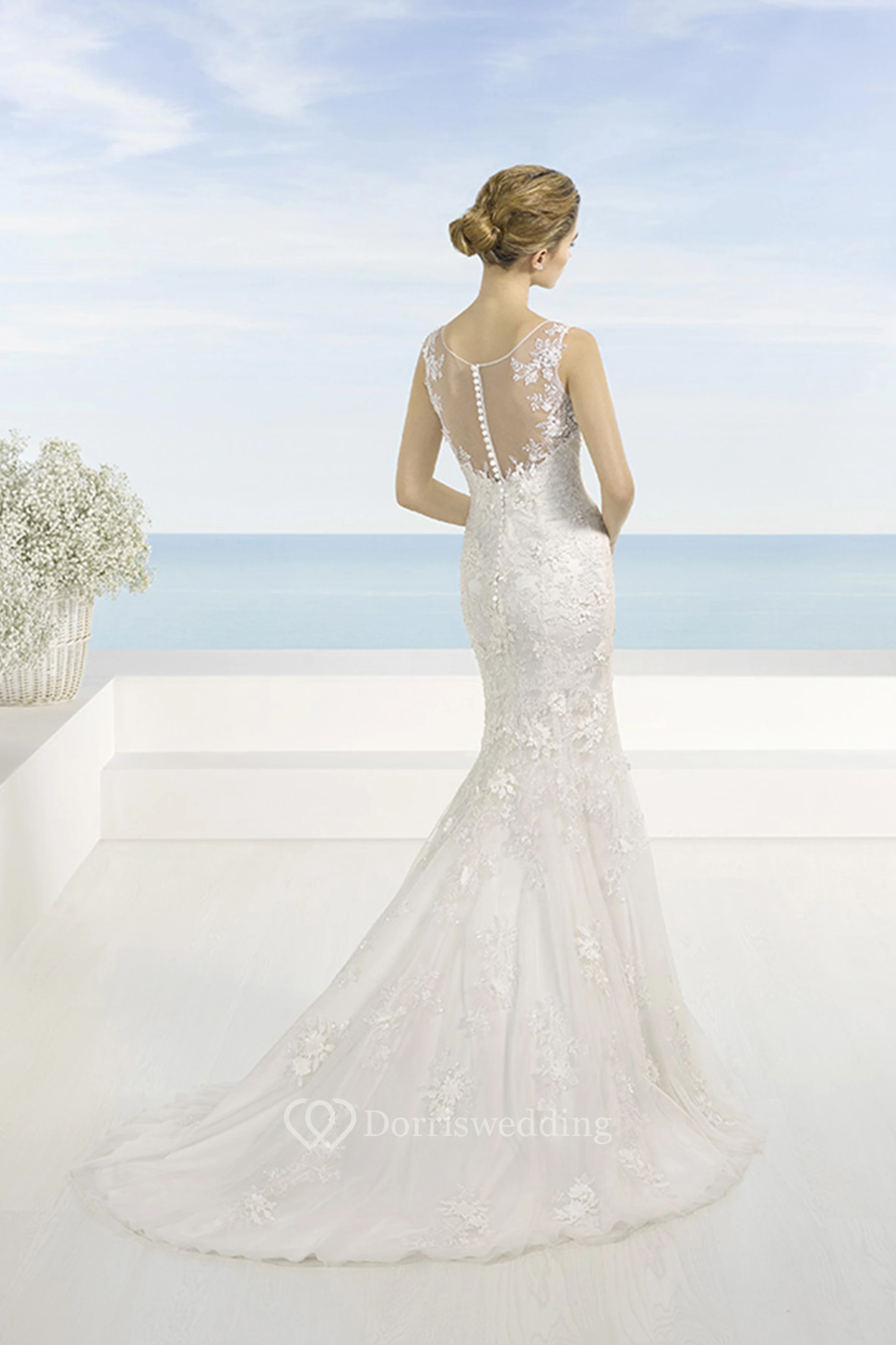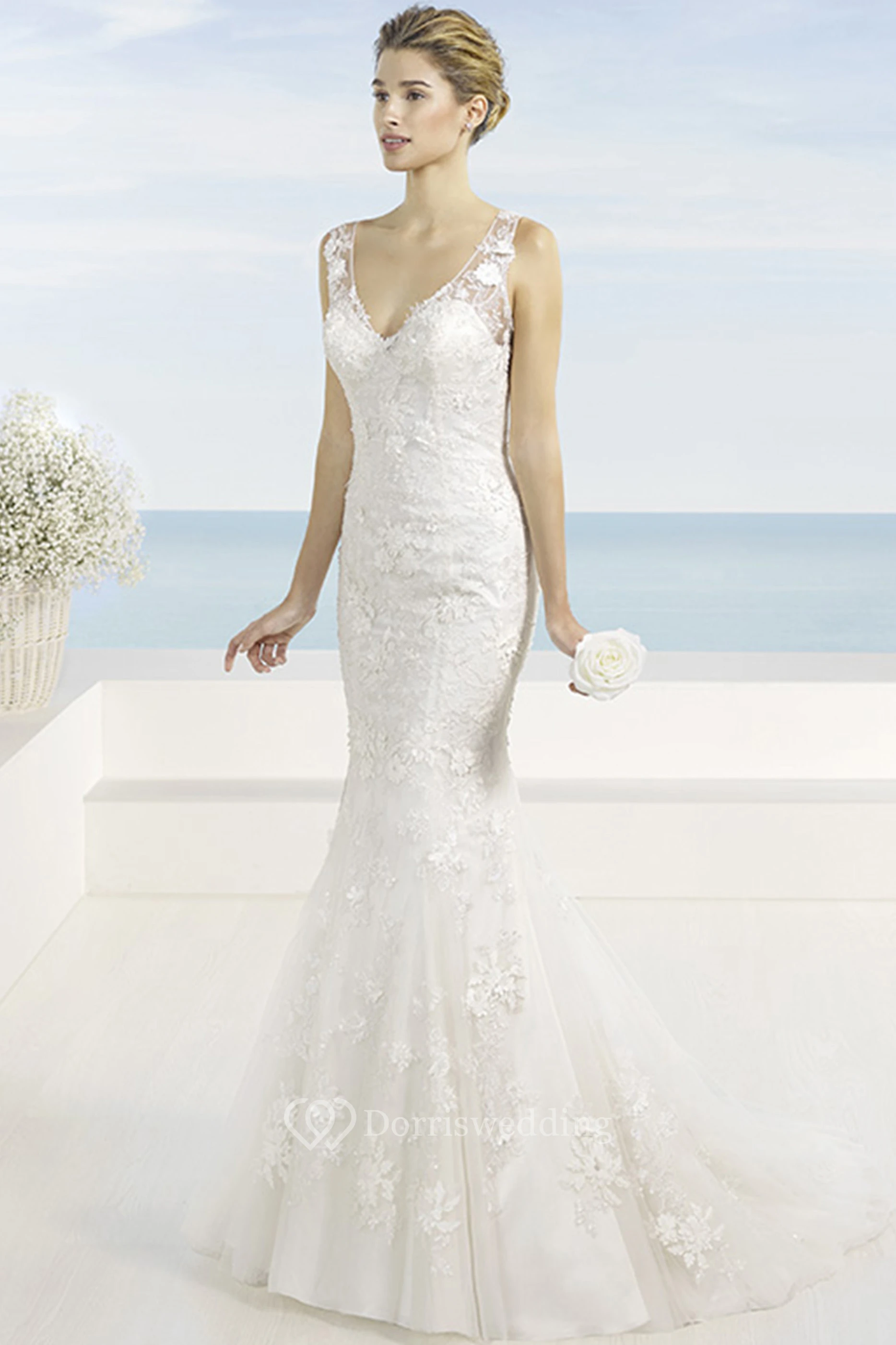 Sheath Sleeveless V-Neck Maxi Appliqued Lace Wedding Dress With Court Train And Illusion Back