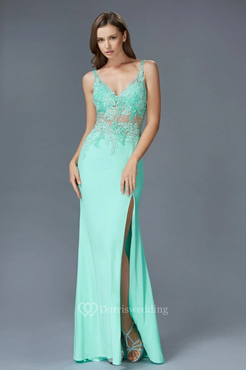 Sheath Spaghetti Sleeveless Jersey Low-V Back Dress With Appliques And Split Front