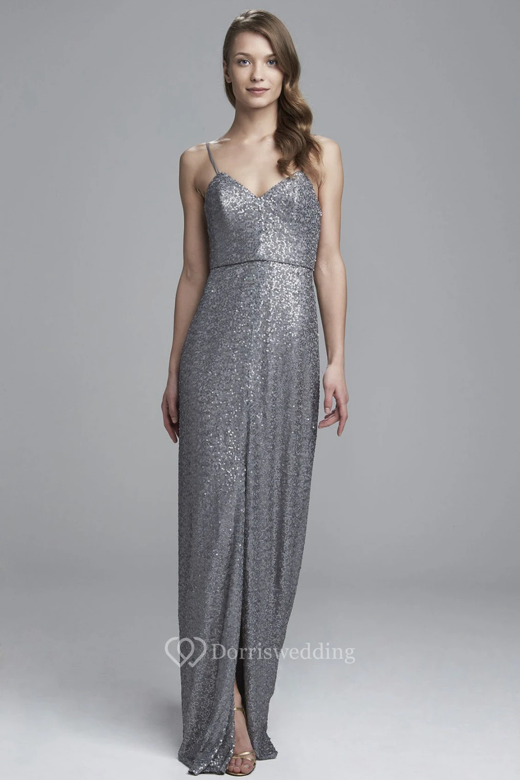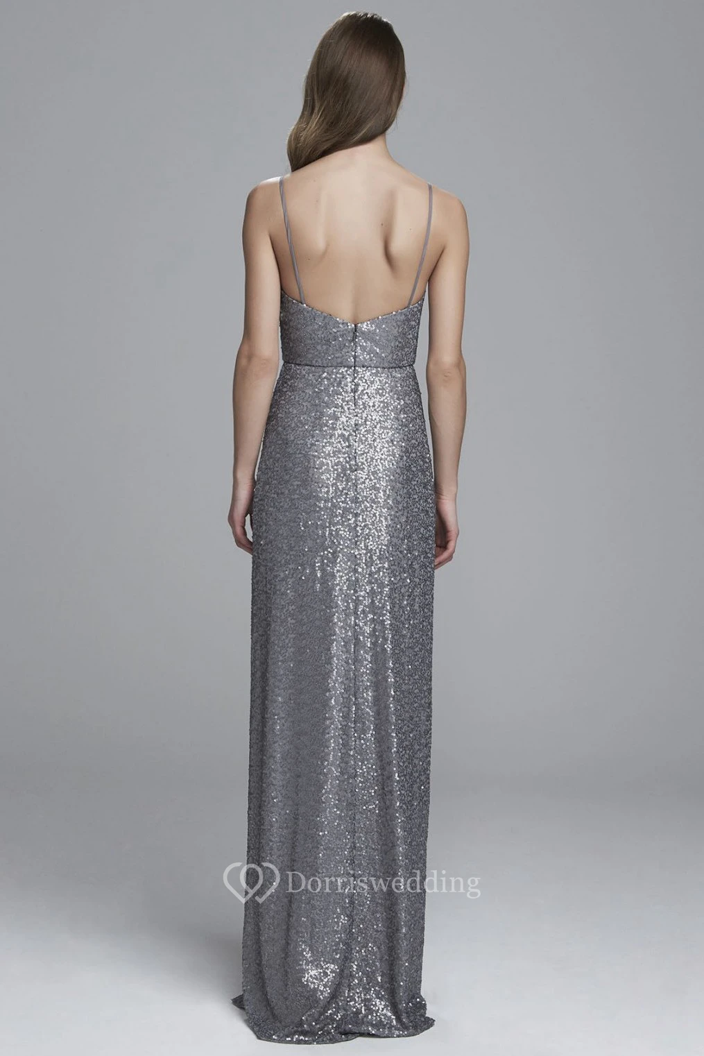 Sheath Spaghetti Sleeveless Split-Front Sequin Bridesmaid Dress