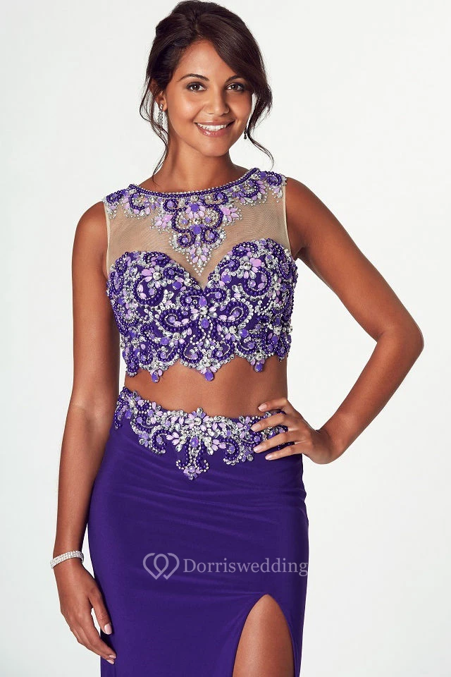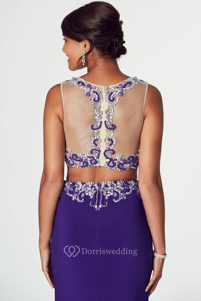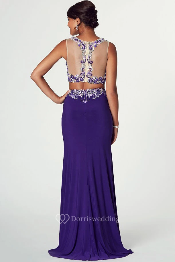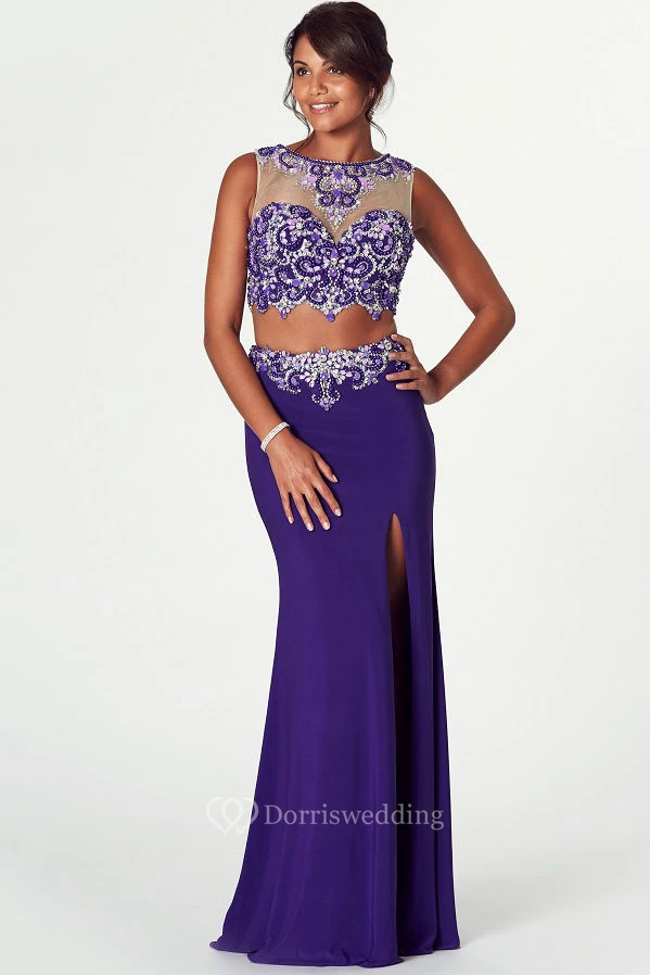 Sheath Split-Front Jewel-Neck Sleeveless Floor-Length Jersey Prom Dress With Beading
