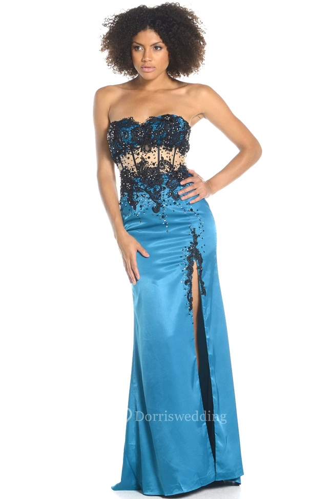 Sheath Split-Front Sleeveless Long Sweetheart Satin Prom Dress With Corset Back And Appliques