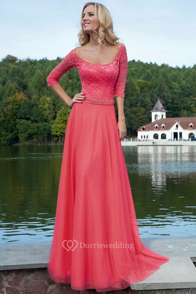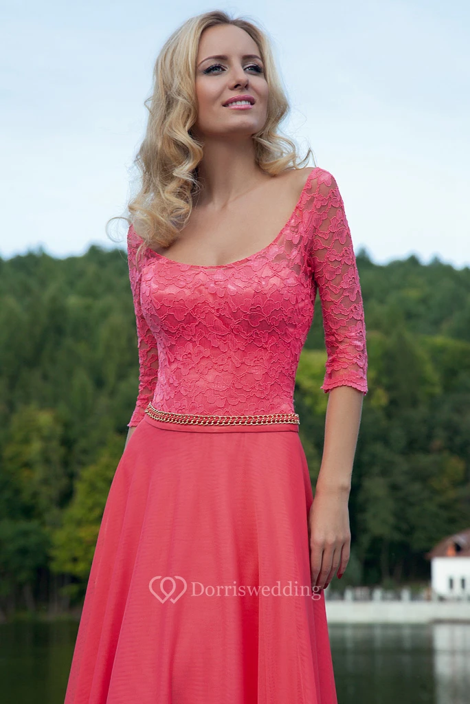 Sheath Square-Neck Maxi Half-Sleeve Lace Tulle Prom Dress With Waist Jewellery