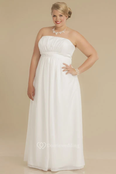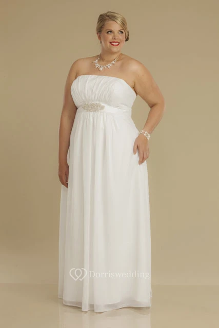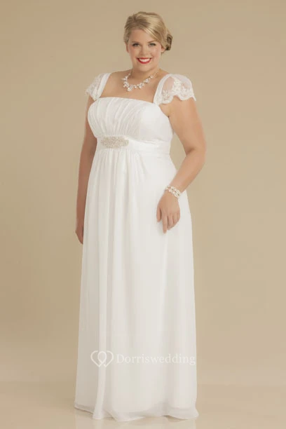 Sheath Square-Neck Ruched Empire Cap-Sleeve Chiffon Plus Size Wedding Dress With Waist Jewellery