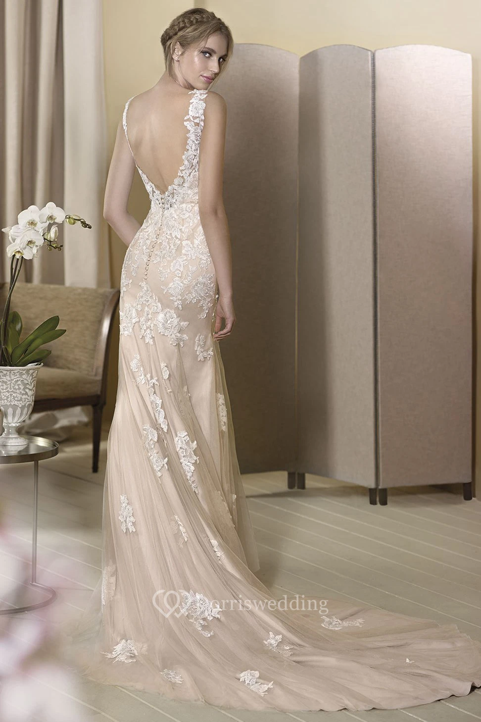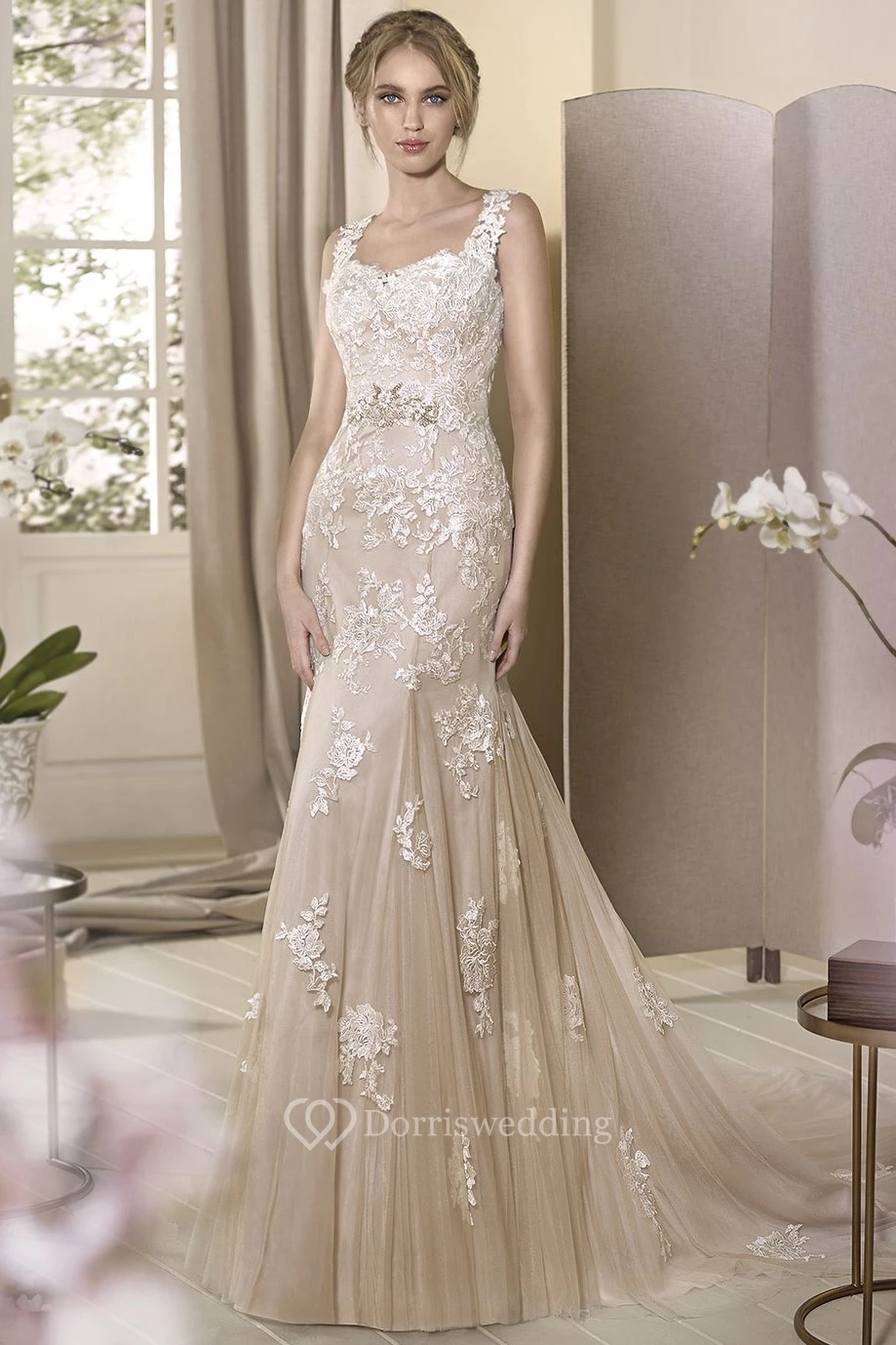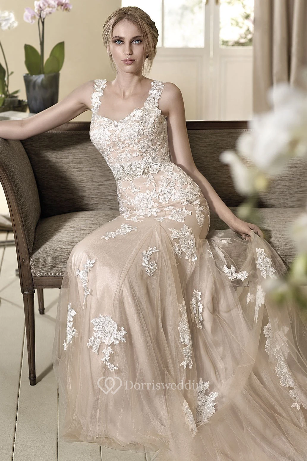 Sheath Square-Neck Sleeveless Floor-Length Appliqued Tulle&Lace Wedding Dress With Beading