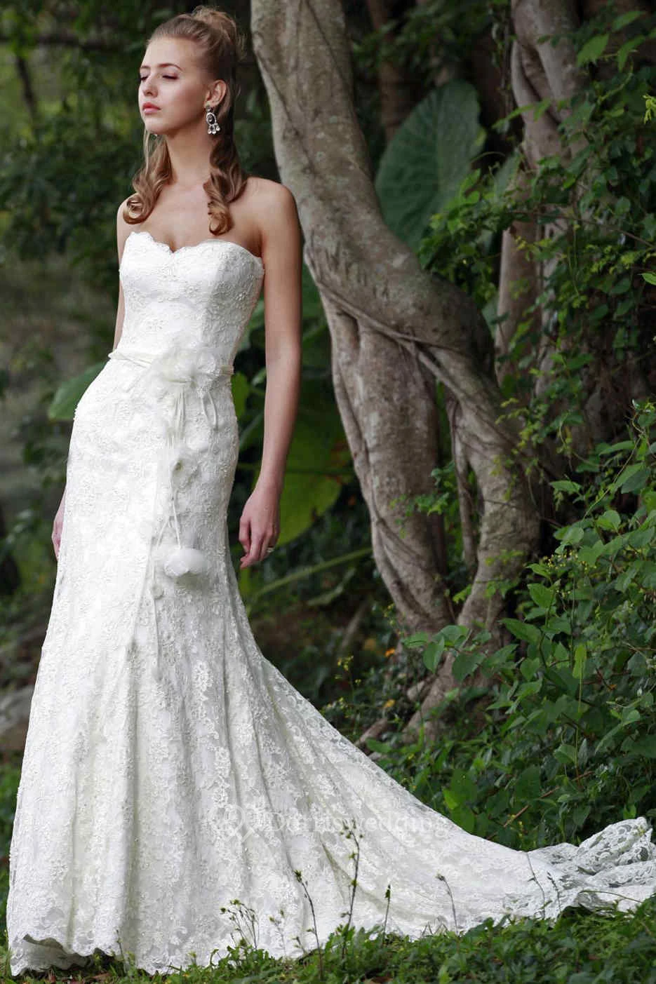 Sheath Strapless Appliqued Floor-Length Lace Wedding Dress With Flower And Court Train