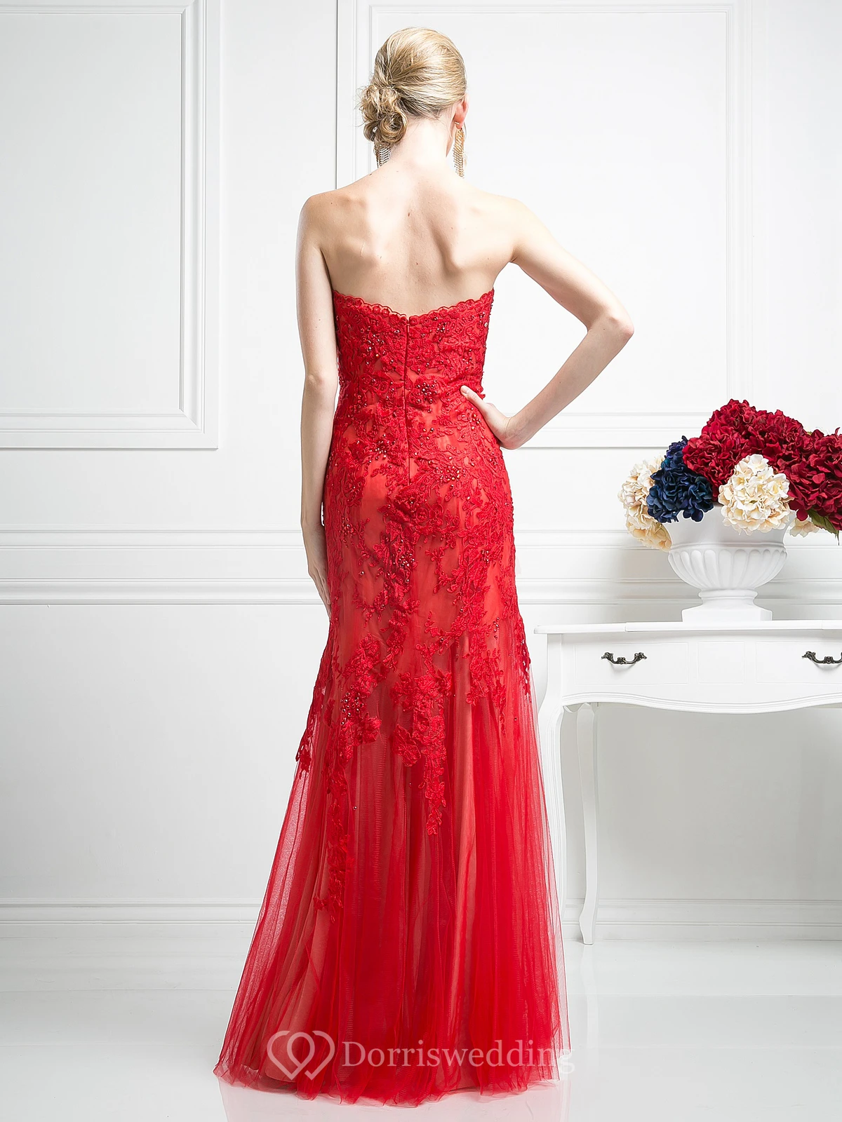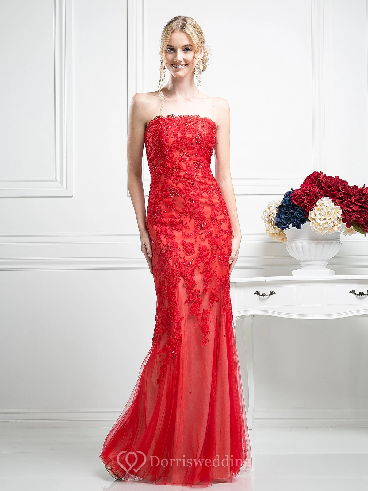 Sheath Strapless Sleeveless Lace Tulle Low-V Back Dress With Appliques And Beading