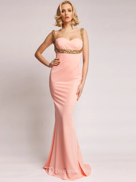 Sheath Strapped Sleeveless Beaded Long Jersey Prom Dress