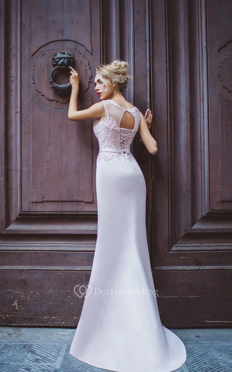 Sheath Sweep Bateau Short Sleeve Satin Pleats Appliques Lace-Up Dress