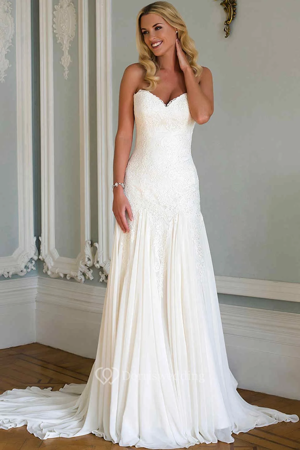 Sheath Sweetheart Chiffon&Lace Wedding Dress With Pleats And Court Train