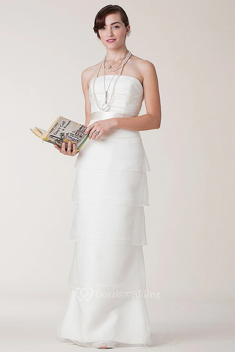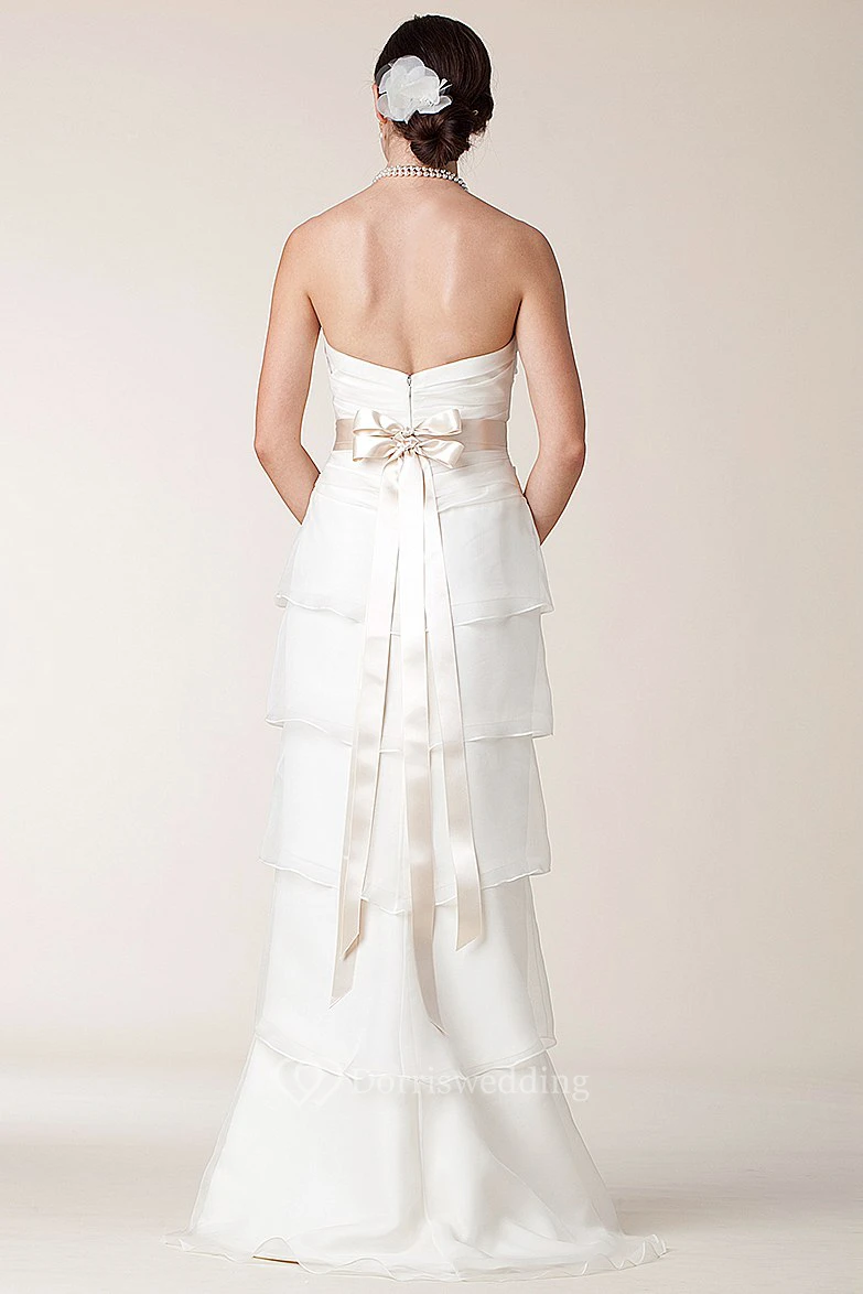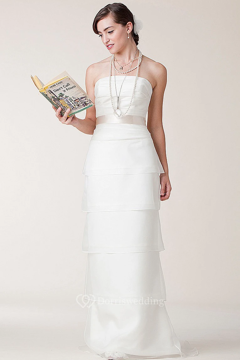 Sheath Tiered Strapless Long Sleeveless Satin Wedding Dress With Bow