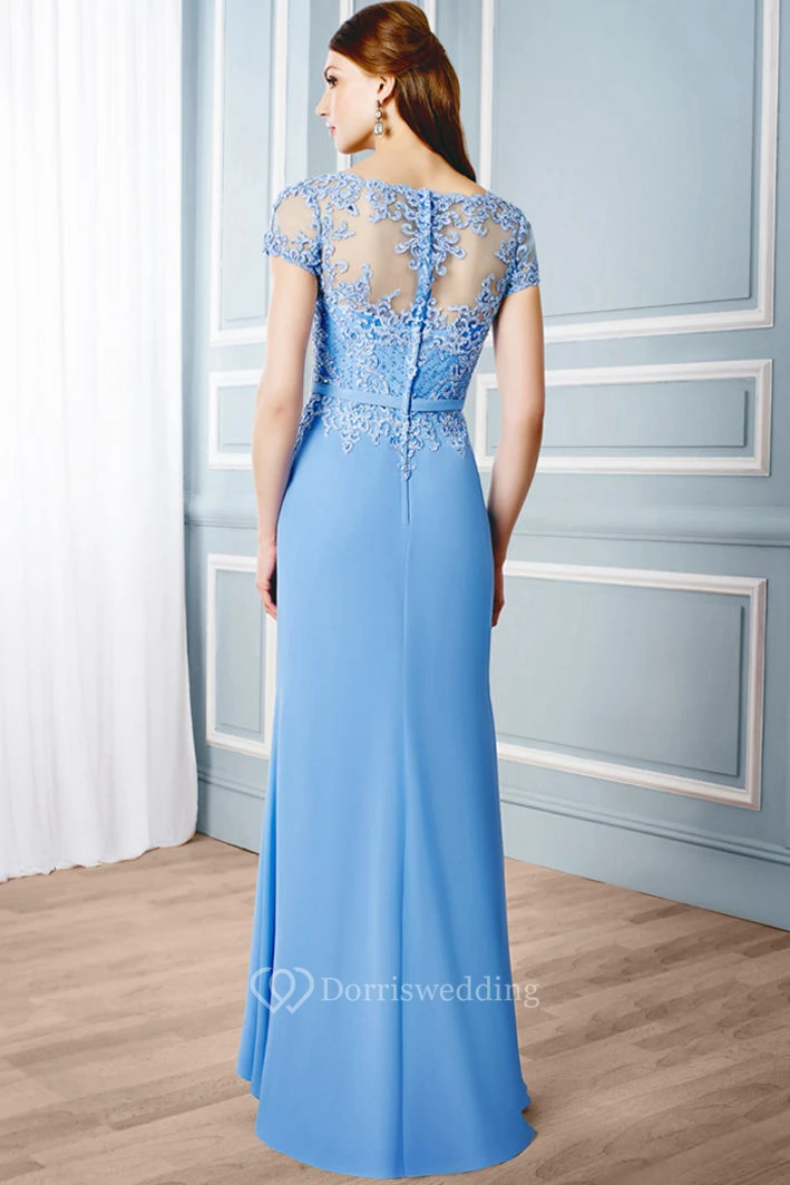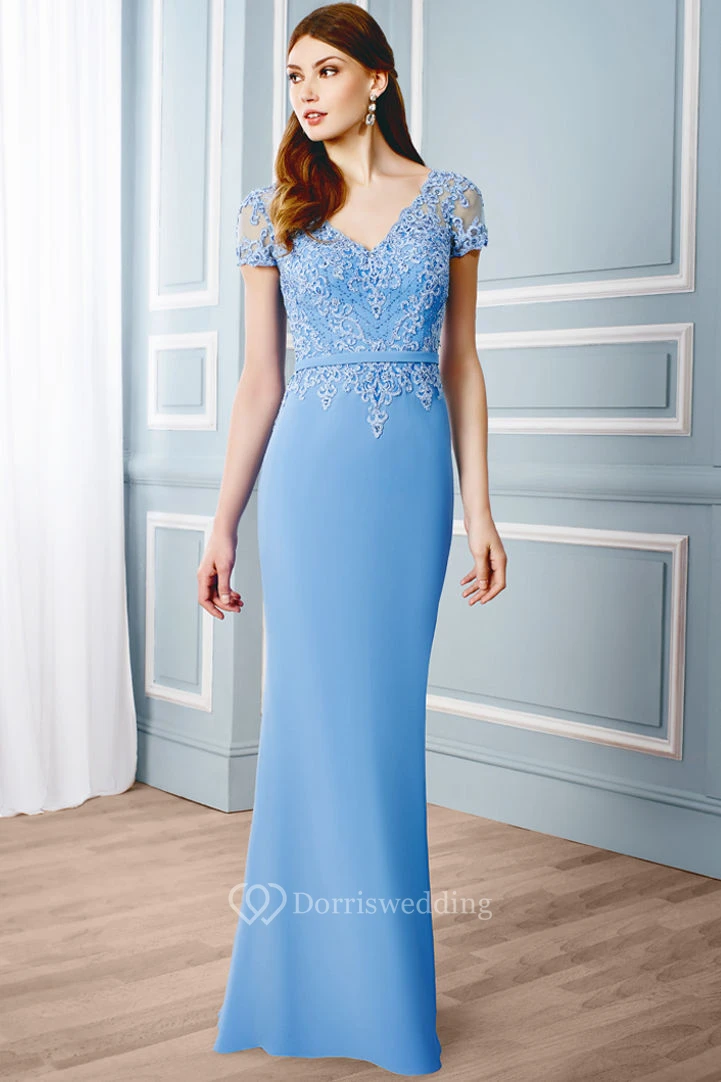 Sheath V-Neck Appliqued Cap Sleeve Chiffon Formal Dress