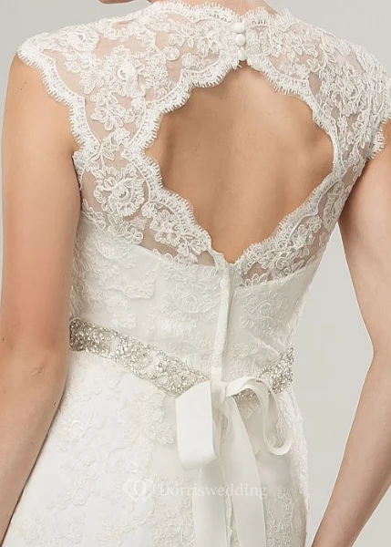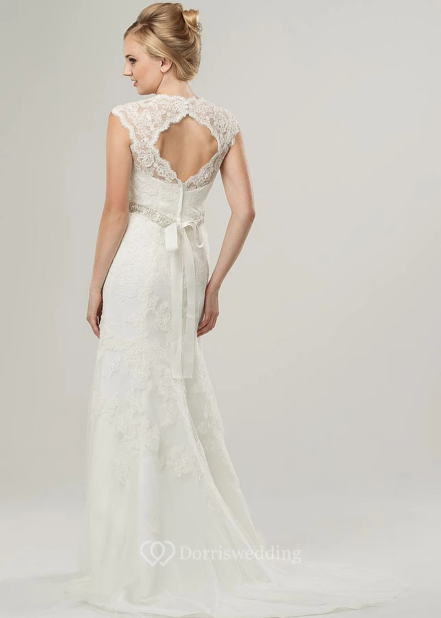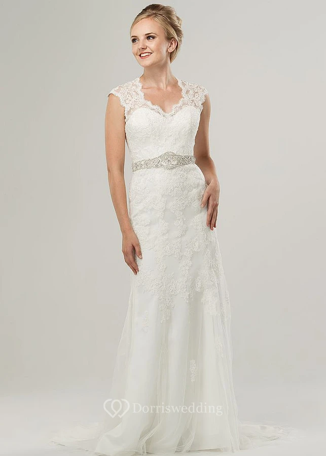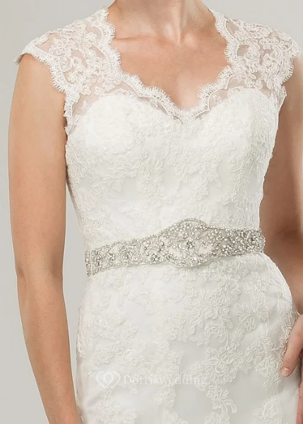 Sheath V-Neck Appliqued Cap-Sleeve Long Lace&Tulle Wedding Dress With Waist Jewellery And Bow