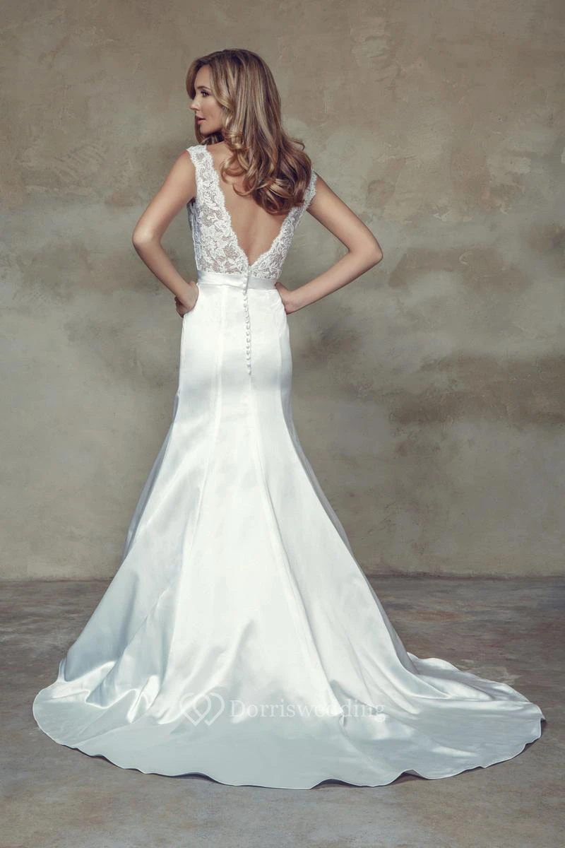 Sheath V-Neck Appliqued Long Sleeveless Satin Wedding Dress With Beading And Deep-V Back