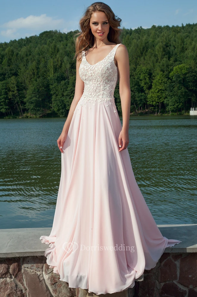 Sheath V-Neck Appliqued Sleeveless Floor-Length Chiffon Prom Dress