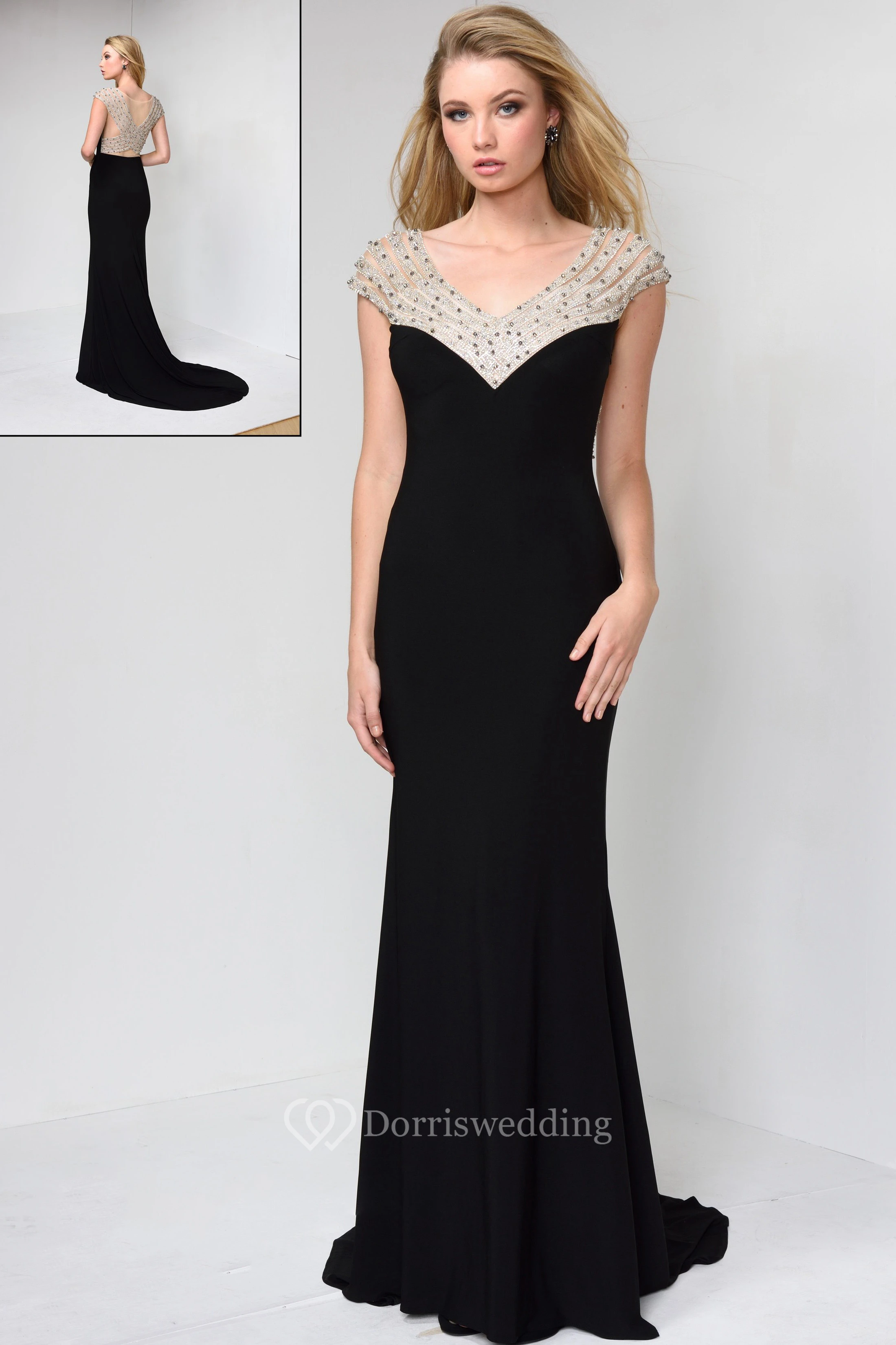 Sheath V-Neck Cap-Sleeve Jersey Court Train Low-V Back Dress With Beading