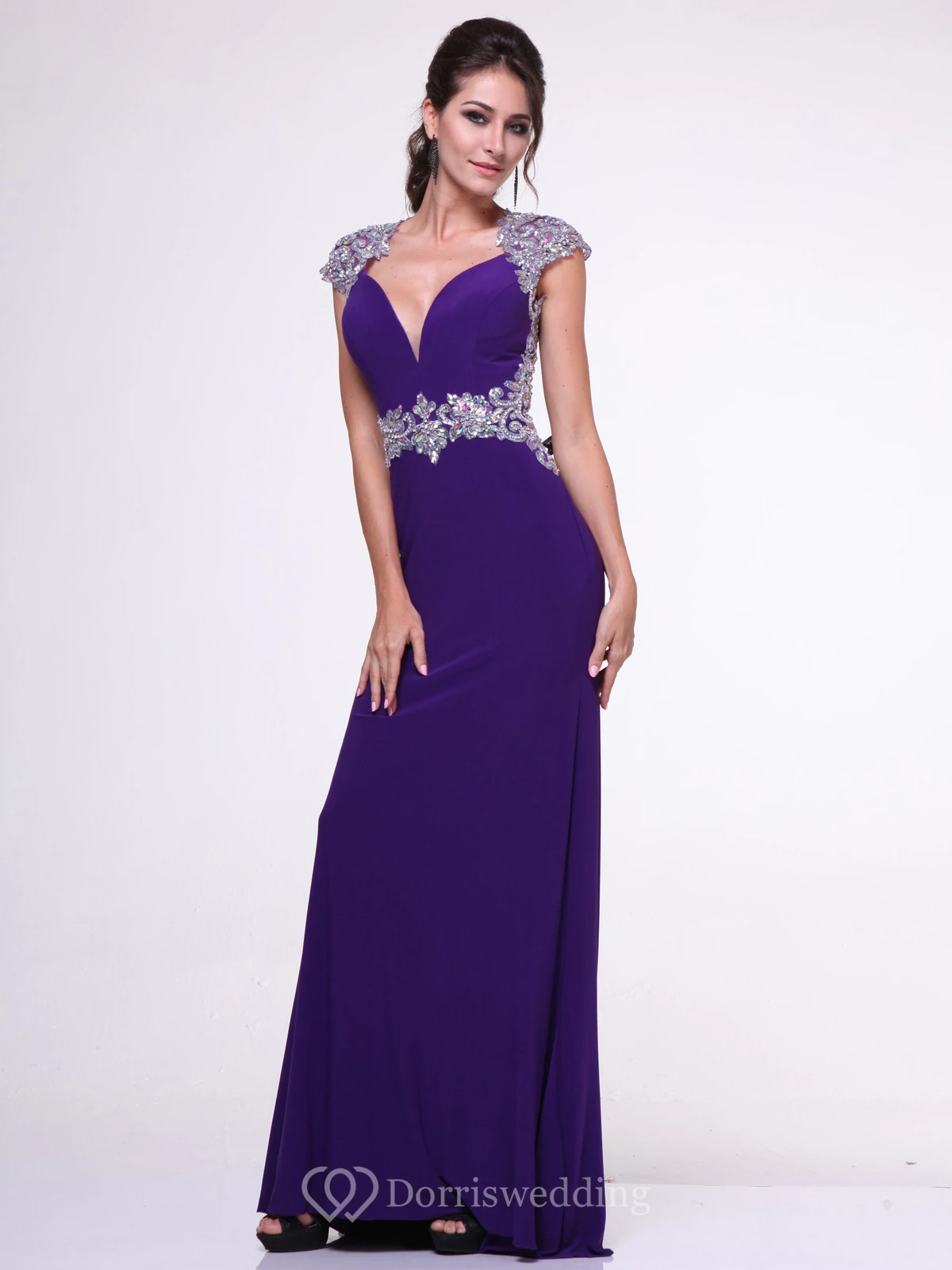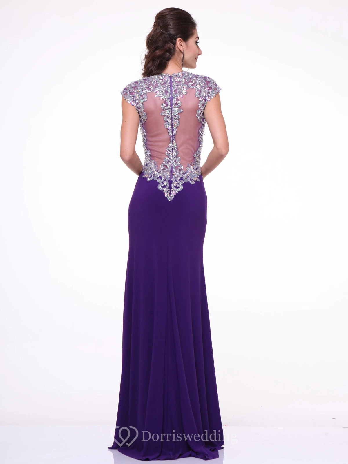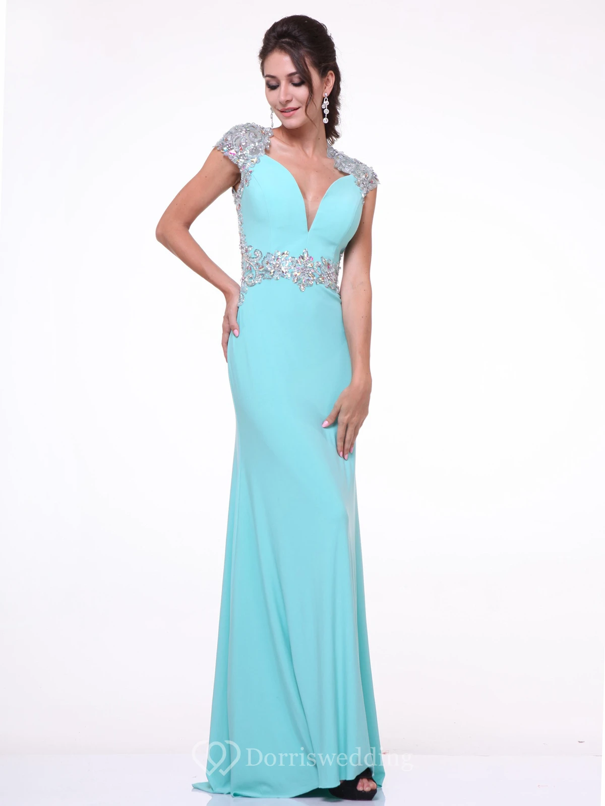 Sheath V-Neck Cap-Sleeve Jersey Illusion Dress With Beading And Waist Jewellery