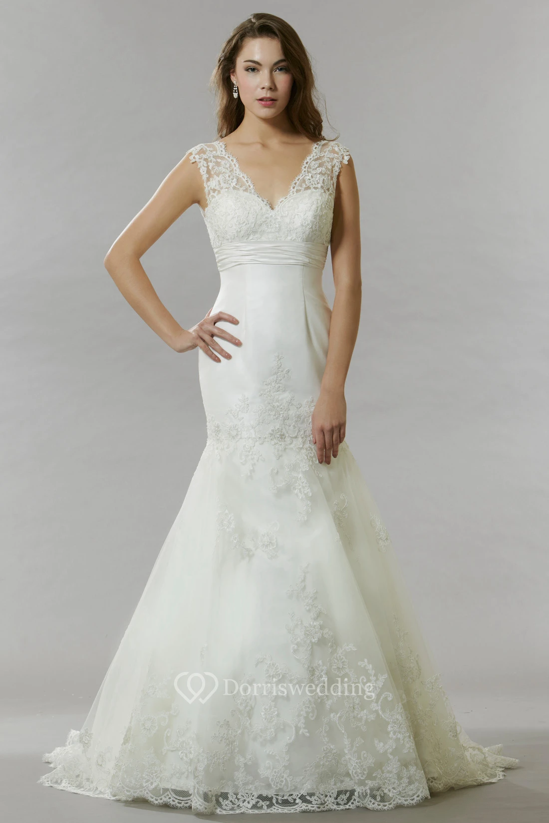 Sheath V-Neck Cap-Sleeve Lace Wedding Dress