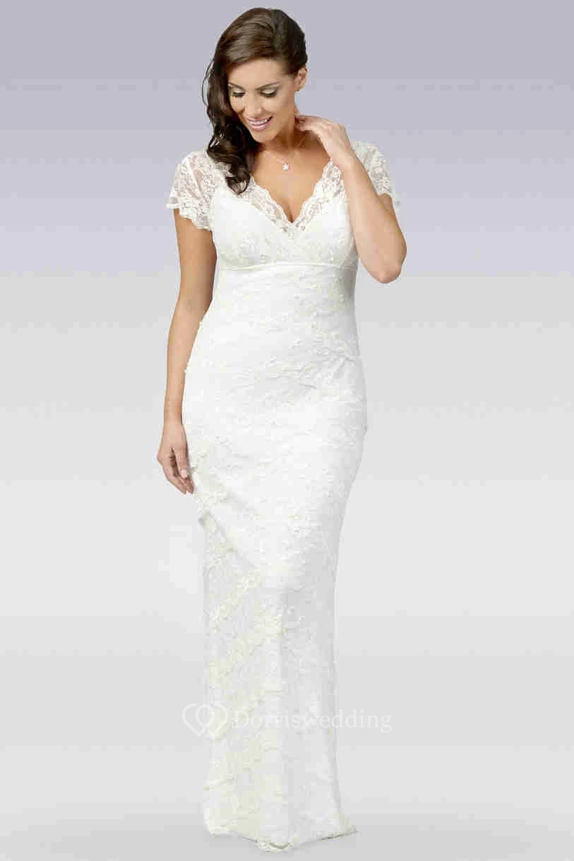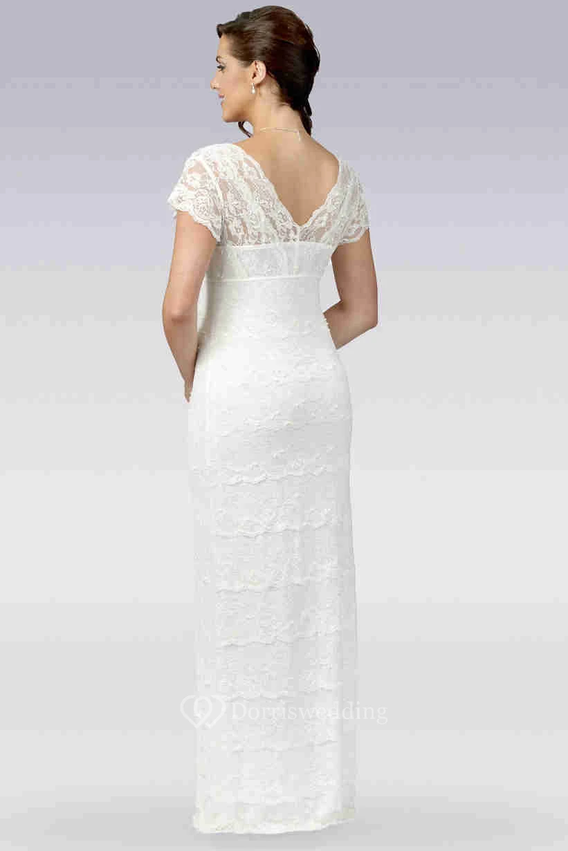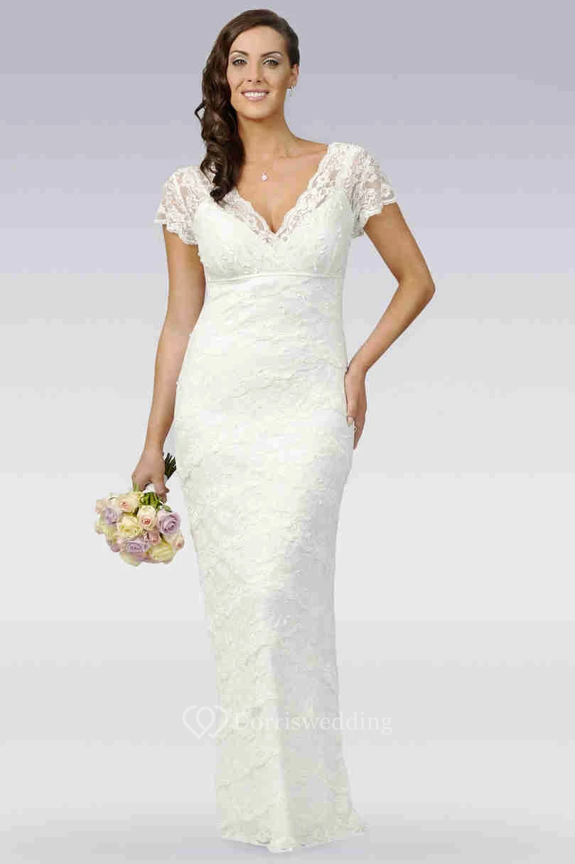 Sheath V-Neck Cap-Sleeve Lace Wedding Dress