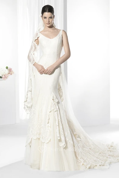 Sheath V-Neck Floor-Length Appliqued Sleeveless Satin&Tulle Wedding Dress