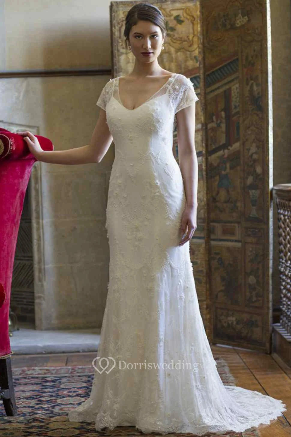 Sheath V-Neck Floor-Length Cap-Sleeve Lace Wedding Dress With Appliques And Keyhole