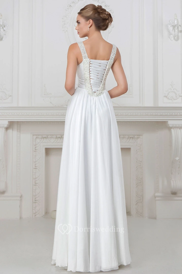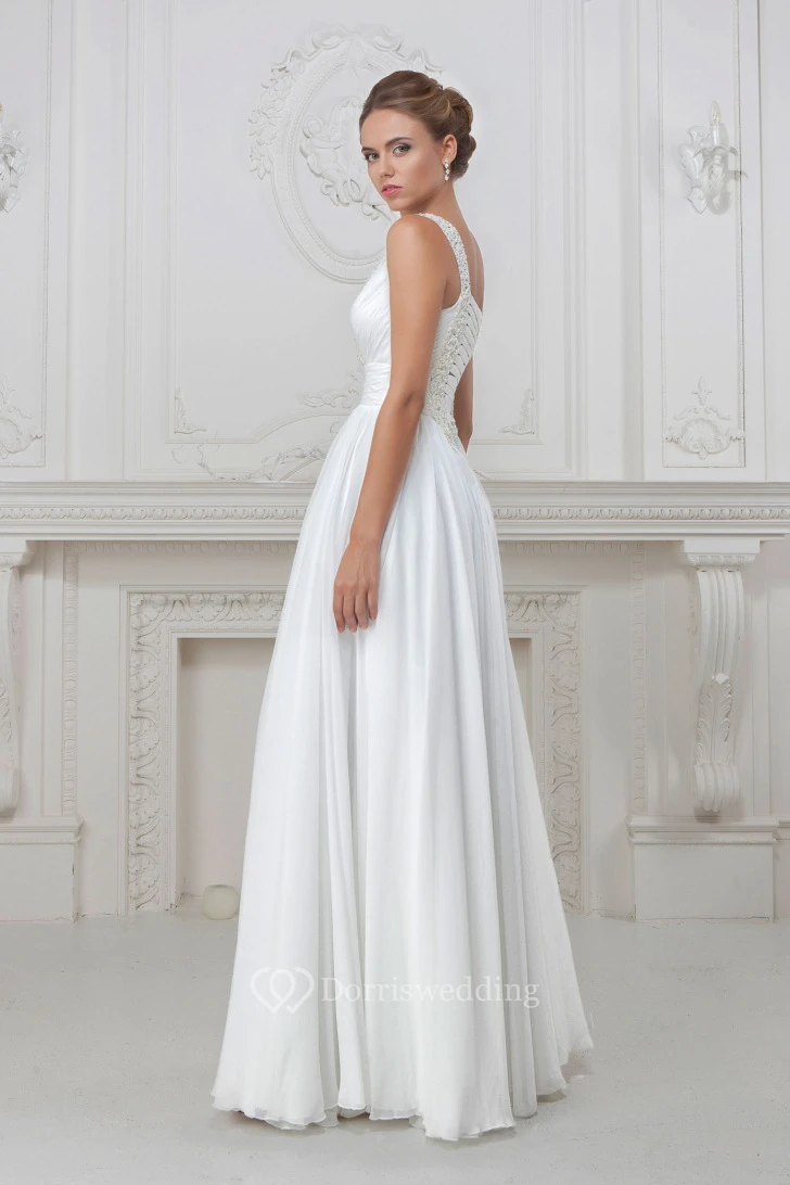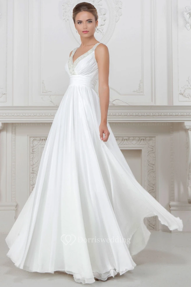 Sheath V-Neck Floor-Length Sleeveless Ruched Satin Wedding Dress With Beading