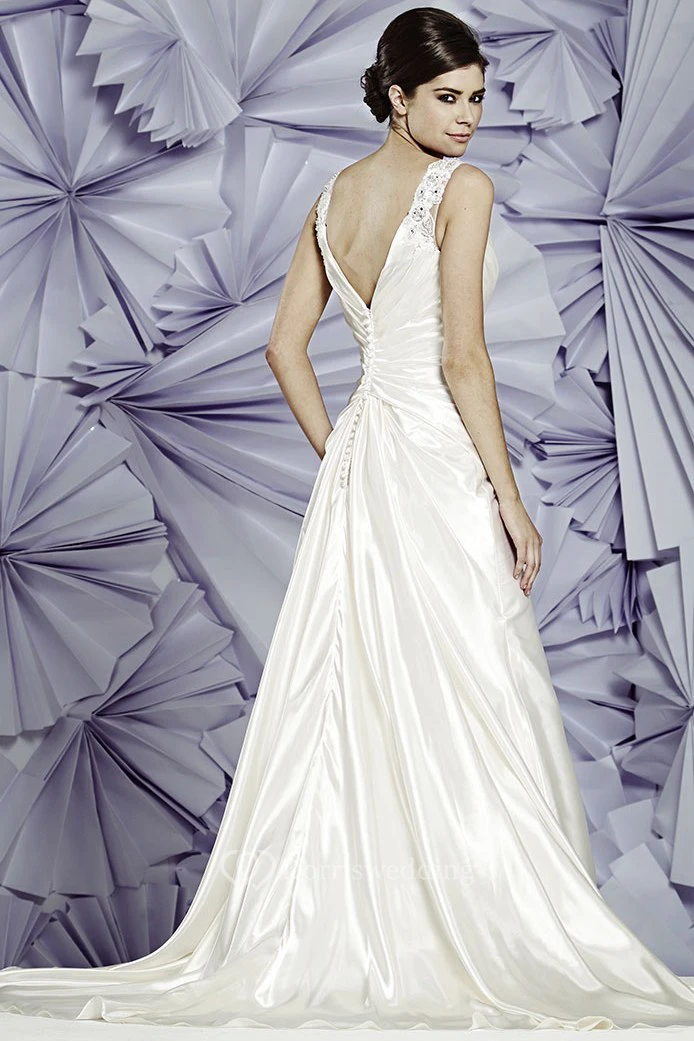 Sheath V-Neck Floral Floor-Length Sleeveless Stretched Satin Wedding Dress With Appliques And Ruffles