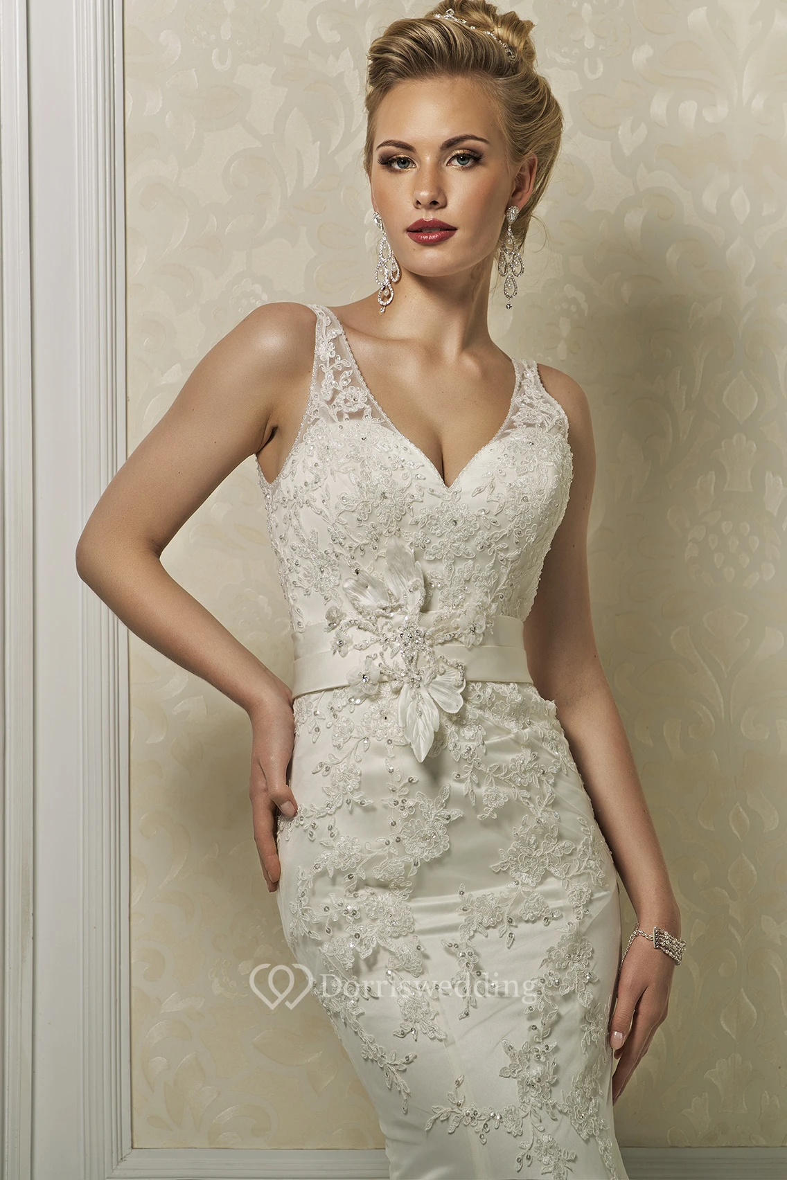 Sheath V-Neck Long Appliqued Sleeveless Lace Wedding Dress With Beading