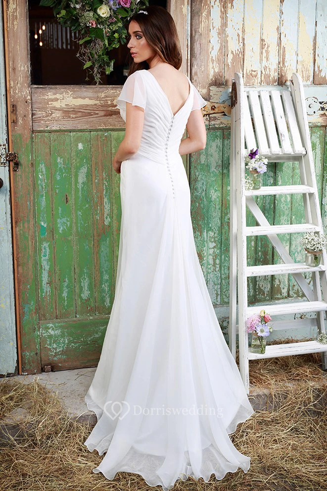 Sheath V-Neck Poet-Sleeve Chiffon Wedding Dress With Criss Cross