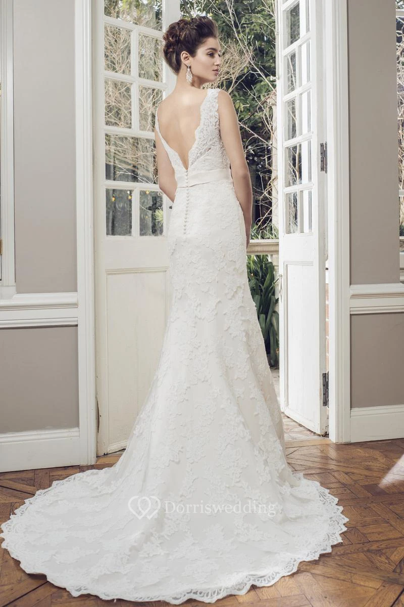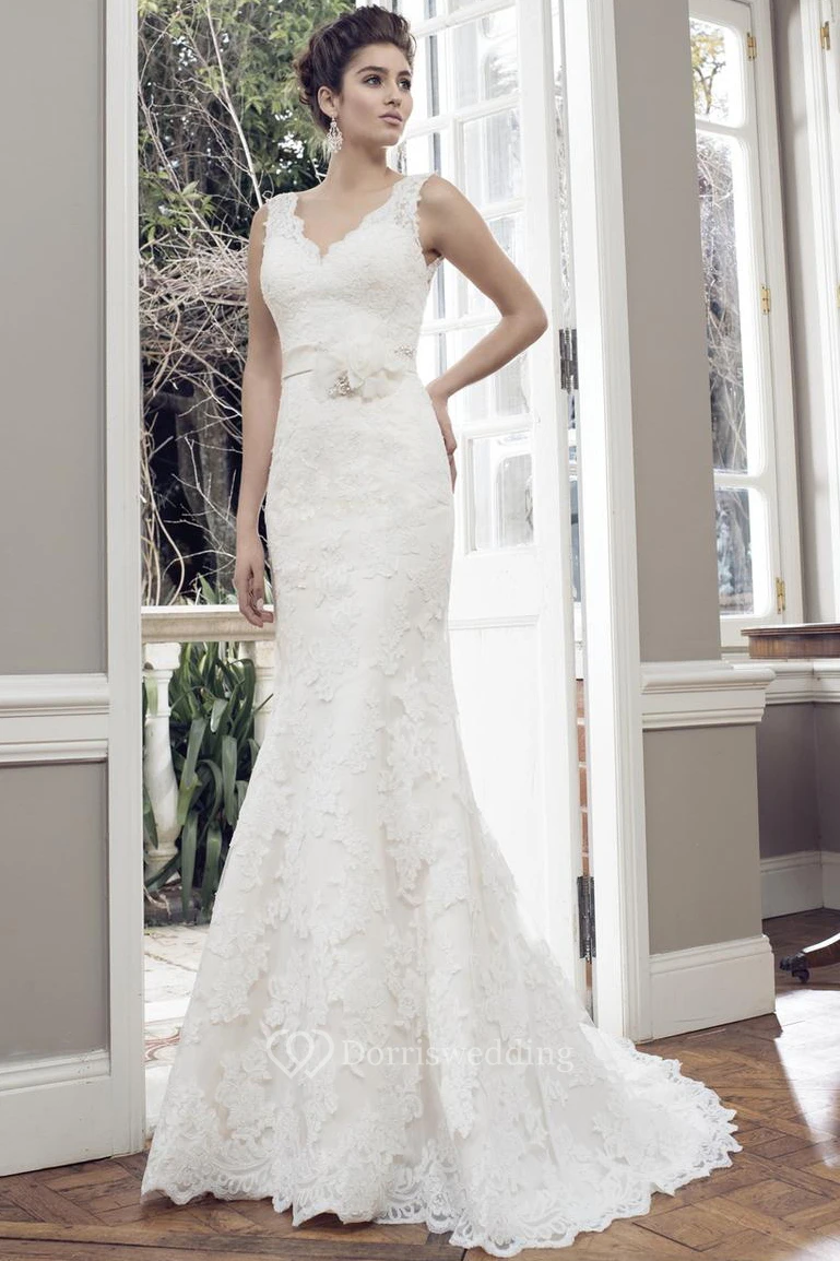 Sheath V-Neck Sleeveless Appliqued Floor-Length Lace Wedding Dress Styles With Flower And Low-V Back