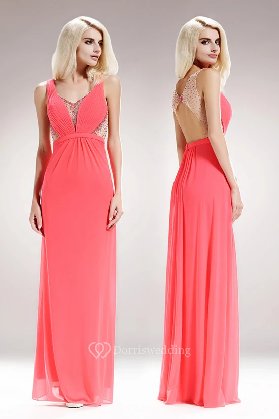 Sheath V-Neck Sleeveless Chiffon Keyhole Dress With Ruching And Beading