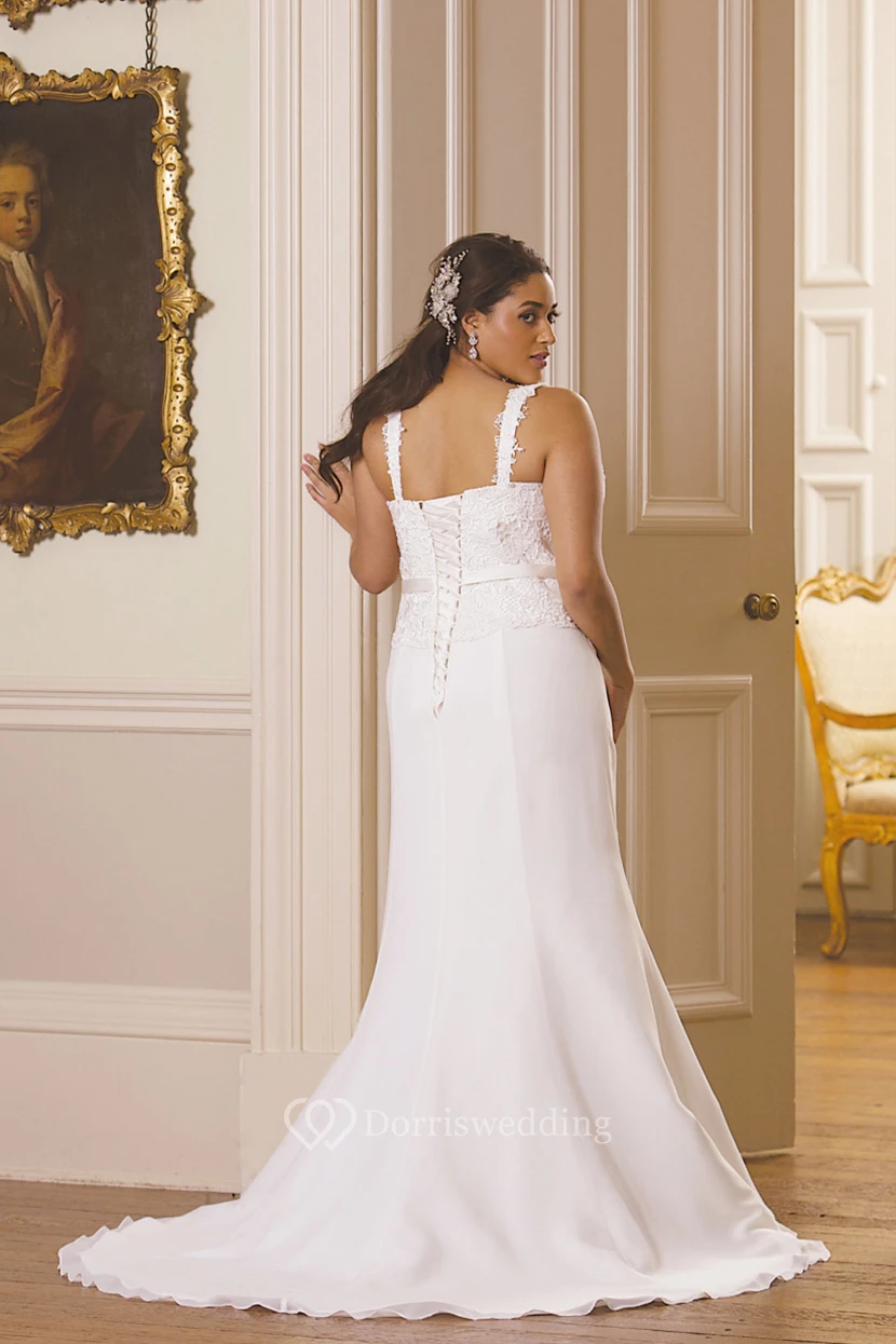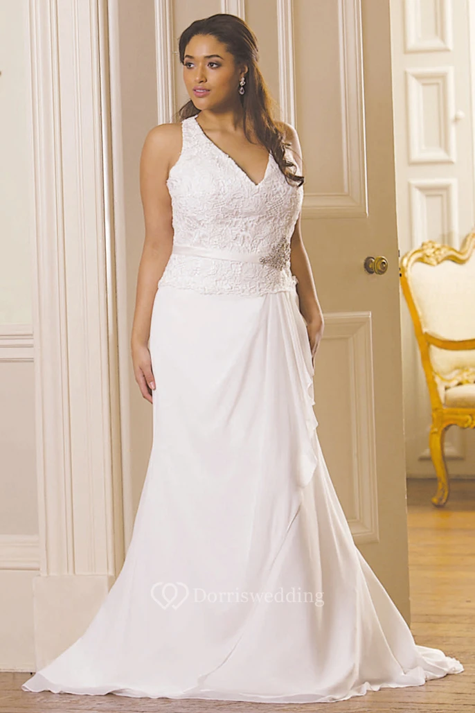 Sheath V-Neck Sleeveless Jeweled Chiffon Plus Size Wedding Dress With Draping