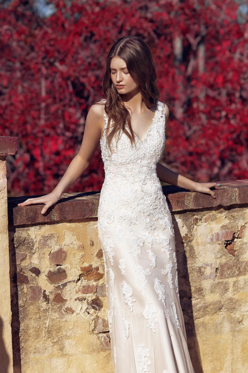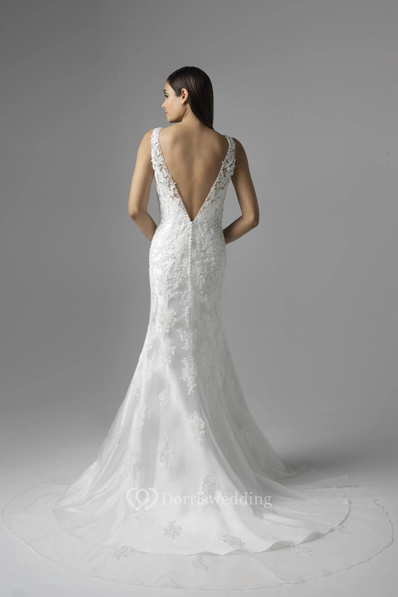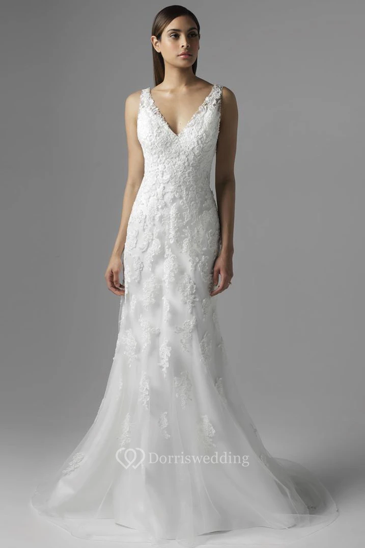Sheath V-Neck Sleeveless Long Appliqued Lace&Tulle Wedding Dress With Chapel Train And Deep-V Back