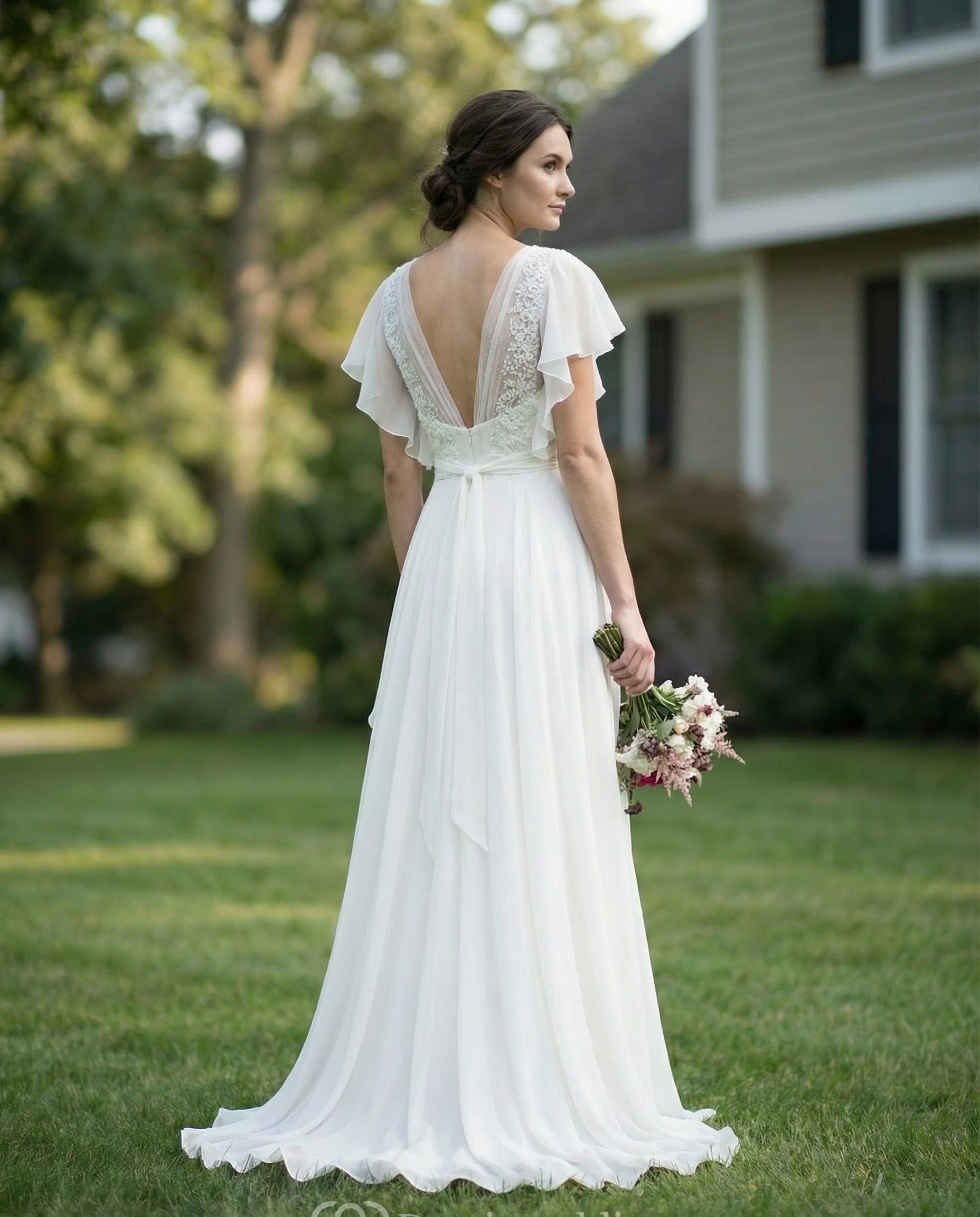 To make it easier for you to walk post-ceremony and dance, our seamstresses add buttons, or ribbons into the dress by lifting up the train or tucking it into itself.