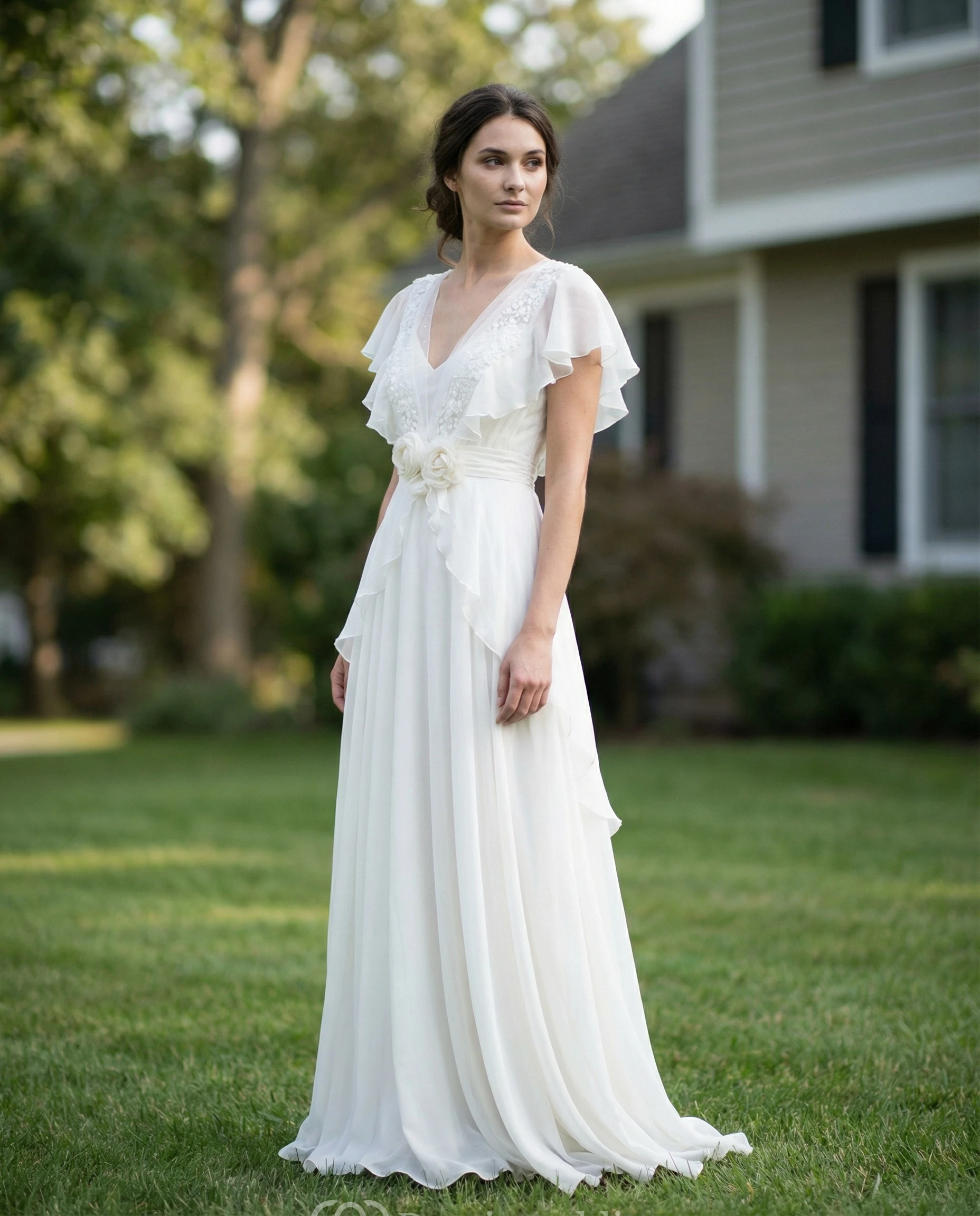 Sheer Sleeve Boho Chiffon Gown with Pearl Beading