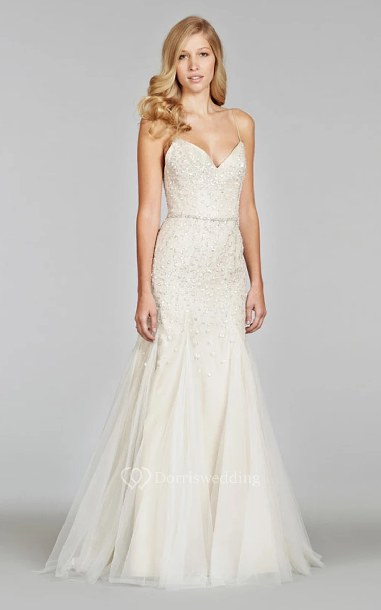 Shimmering Spaghetti Strap Tulle Gown With Sequin Embroidered Bodice